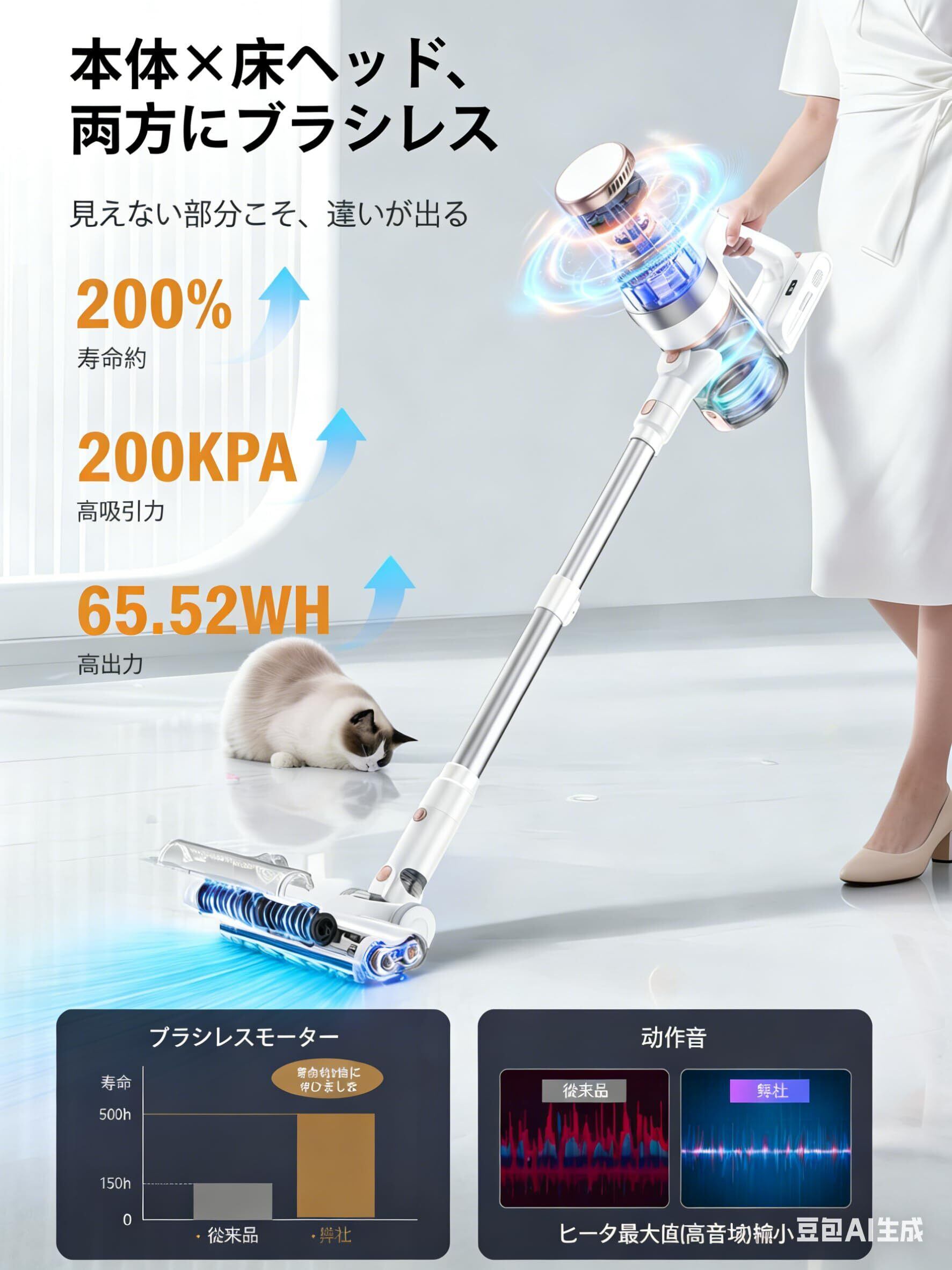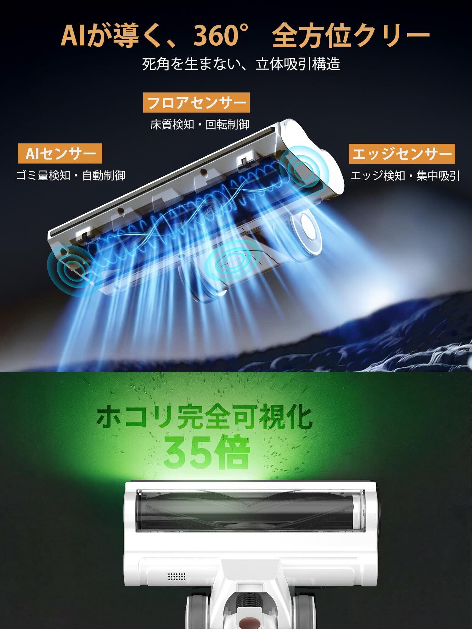 ️【世界初デュアルブラシレスモーター搭載・最大200KPa超強力吸引!AI自動制御×3段階パワーモード】LUNINO 2026年最新革新モデルVC2コードレス掃除機は、業界トップクラスの200KPaハイパワー吸引を実現する550W高性能ブラシレスモーターを採用した強力掃除機。床面やゴミ量を検知するAIスマート自動制御機能により、吸引力を自動調整し、省エネと超強力吸引を両立するコードレスクリーナーです。静音設計ながら安定した高出力を維持し、吸引効率100%設計で微細ホコリ・ハウスダスト・花粉・PM2.5まで徹底除去。本体モーターとフロアヘッドに独立モーターを搭載したデュアルモーター構造により、ブラシで繊維奥のゴミをかき出しながら瞬時に強力吸引する深層クリーンを実現。毎分70,000回転の高速駆動で電圧低下時もパワーロスを抑制し、フローリング・畳・カーペット・ラグ・ペットの毛までしっかり吸引できる軽量スティック型充電式コードレス掃除機。強力・軽量・静音を兼ね備えた家庭用ハイパワー掃除機です。