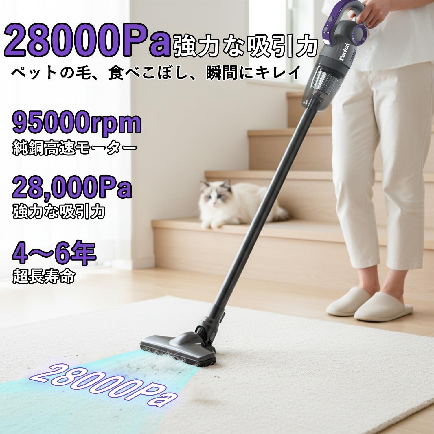 ①【28000Pa瞬発力 vs 猫砂・毛・新生活応援】 【28000Pa】のハイパワー吸引で、ペットの猫砂やカーペットに絡んだ抜け毛も一撃!「コードレスは吸わない」という常識を覆します。新生活 家電として一人暮らし 掃除機をお探しの方に最適。微細なホコリから食べこぼしまで逃さず、毎日の掃除を劇的に楽にします。