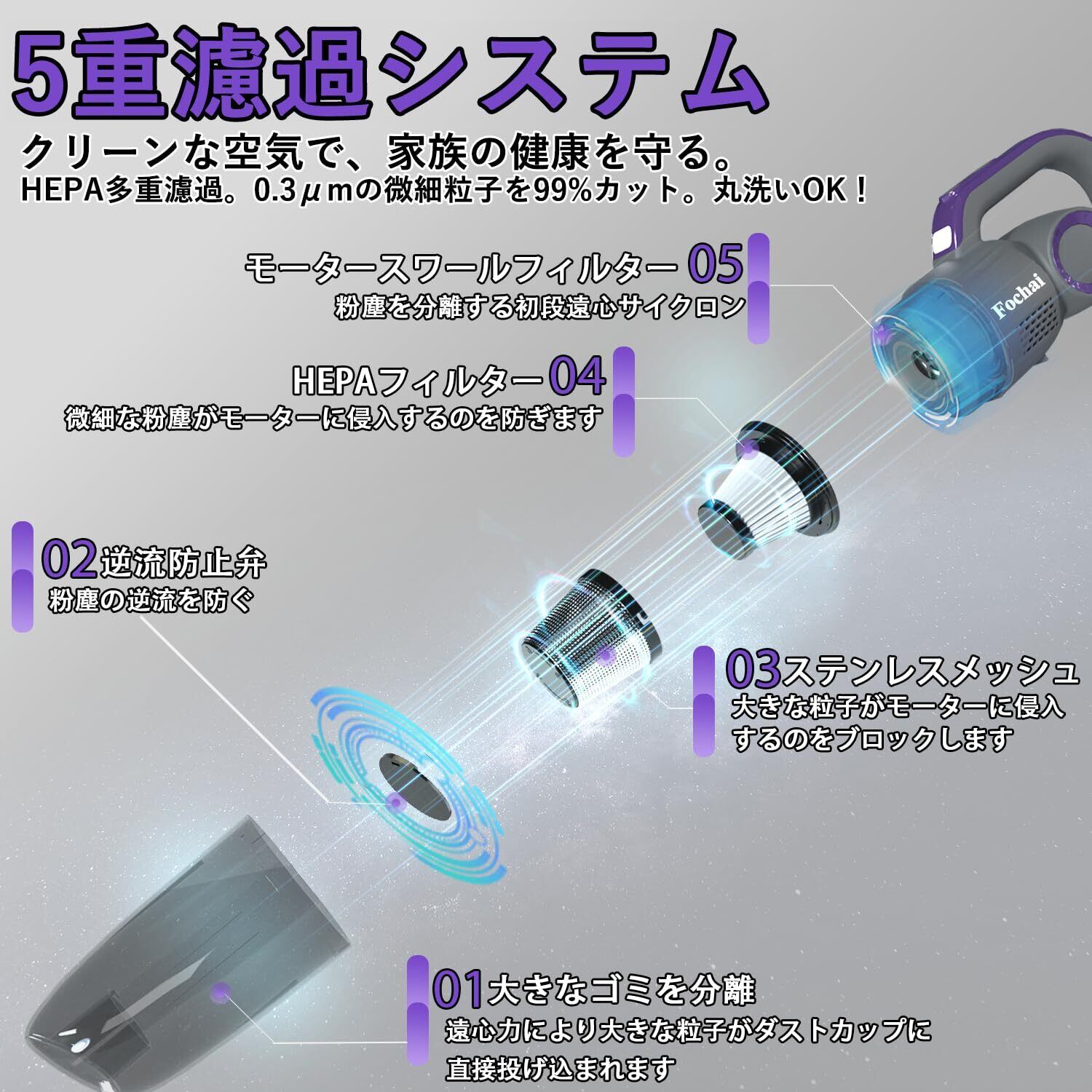 ③【水洗いOK & 経済的な紙パック不要】 ステンレスメッシュとHEPAフィルターの二重構造でゴミを確実にキャッチ。️吸引力を維持する秘訣は、定期的なフィルターのお手入れです。フィルターは丸ごと水洗い可能!紙パック不要のサイクロン式なので、消耗品を買う手間もコストもかからず経済的です。