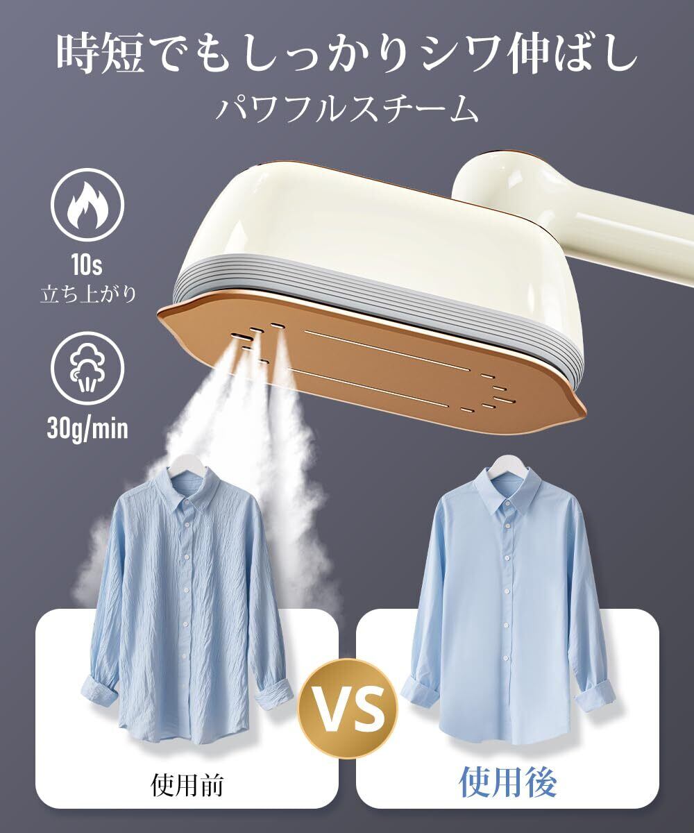 【折りたたみ式&軽量|持ち運びに便利】折りたたみ式のコンパクト設計で、収納や持ち運びも簡単。軽量・小型なので、自宅用としてはもちろん、出張や旅行、オフィス常備用にも最適。日本語説明書付きで初めての方でも安心です。【付属品充実|断熱ベース&計量カップ付き】使用後すぐに置ける断熱ベース(断熱プレート)と、給水時に便利な専用計量カップが付属。火傷や給水ミスを防ぐなど、安全面にも配慮した設計です。初めてスチームアイロンを使う方でも安心して扱える衣類スチーマーで、実用性の高いギフト・プレゼントとしてもおすすめです。