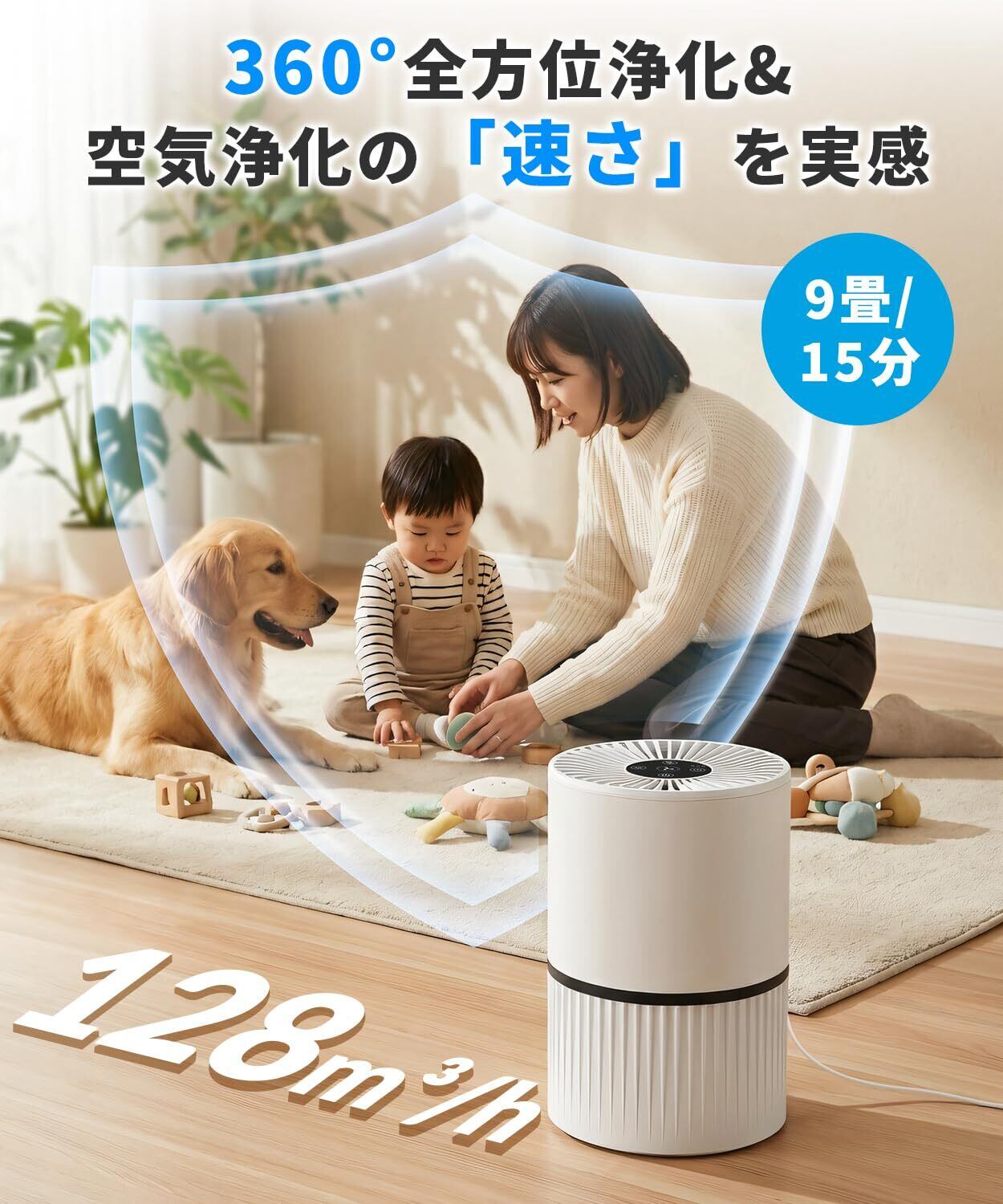 【ペット臭&花粉ダブル対策–家族とペットの快適空間を実現】 革新的な4重ろ過システム(H13 HEPAフィルター+活性炭フィルター含む)を搭載し、微小粒子除去率99.7%を実現!360°全方位循環気流で、ペットのニオイ、花粉、PM2.5、ホコリ、ハウスダスト、カビ、ウイルス、ダニのアレルゲンを強力にキャッチ・除去します。アレルギー症状を大幅に軽減し、ペット飼い家庭やアレルギーに悩む家族全員が、清潔な空気を楽しめます。ペットのフケや毛、生活臭まで徹底除去し、快適な共同生活をサポートします
