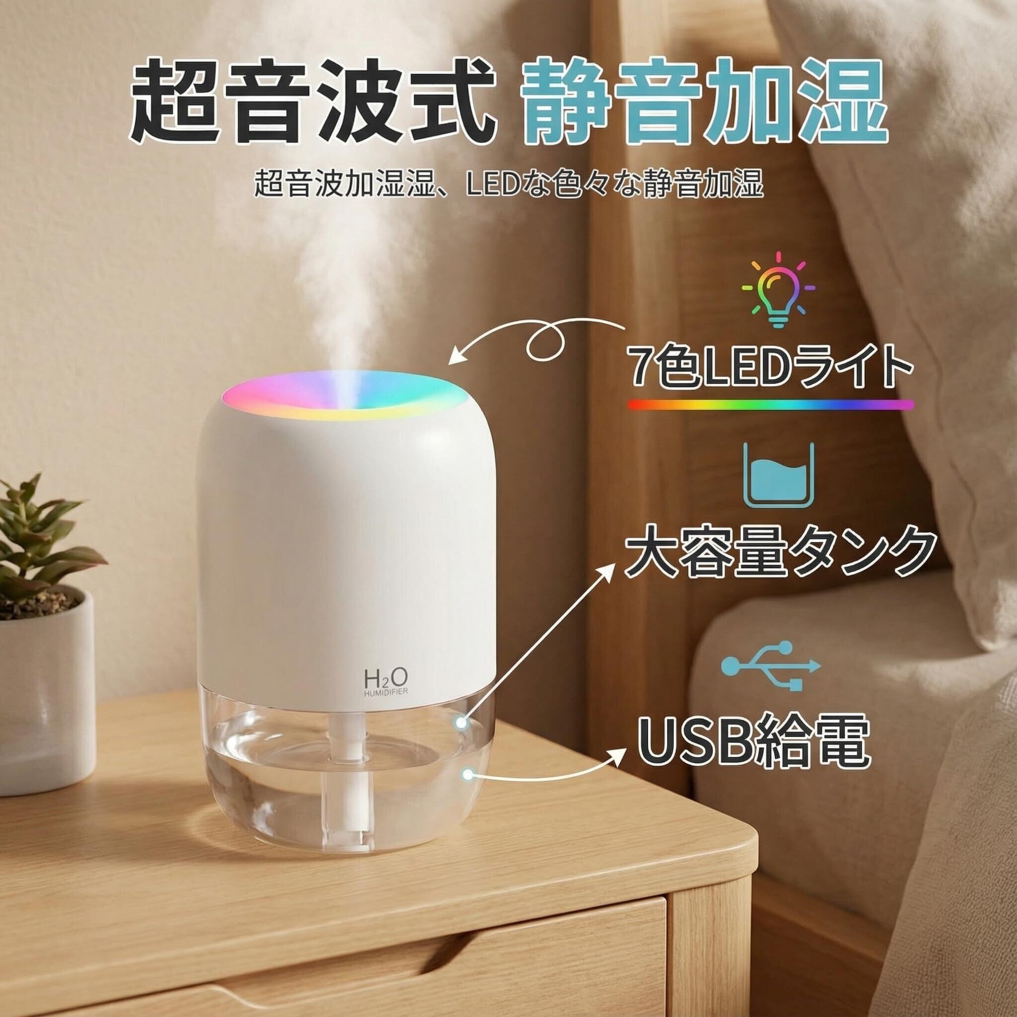 USB接続でしっかり加湿!目に見える霧が乾燥と闘う、コンパクト卓上加湿器 デスクや枕元のパーソナルスペースに、確かな潤いと優しい光を届けるUSB式超音波加湿器。パソコンに繋ぐだけで、目に見える霧が乾燥した空気を瞬時に変えます。 【製品の特長】 確かな加湿感:超音波振動で発生させる微細な霧(ミスト)は、乾燥したのどやお肌に直接アプローチ。加湿状態が目で確認できるので、効果が実感できます。 USB直接給電の便利さ:内蔵電池がないため、充電の手間が一切ありません。パソコンやテレビのUSBポート、市販のACアダプターに接続すれば、即座に連続運転が可能です。 光と霧の癒し空間:7色にゆっくりと変化するLEDライトが、ミストを優しく照らし、お部屋をリラックスムードに包み込みます。 どこでも静かなパートナー:図書館のような静音性を実現。オフィスでの集中作業、寝室での深い眠りを静かにサポートします。