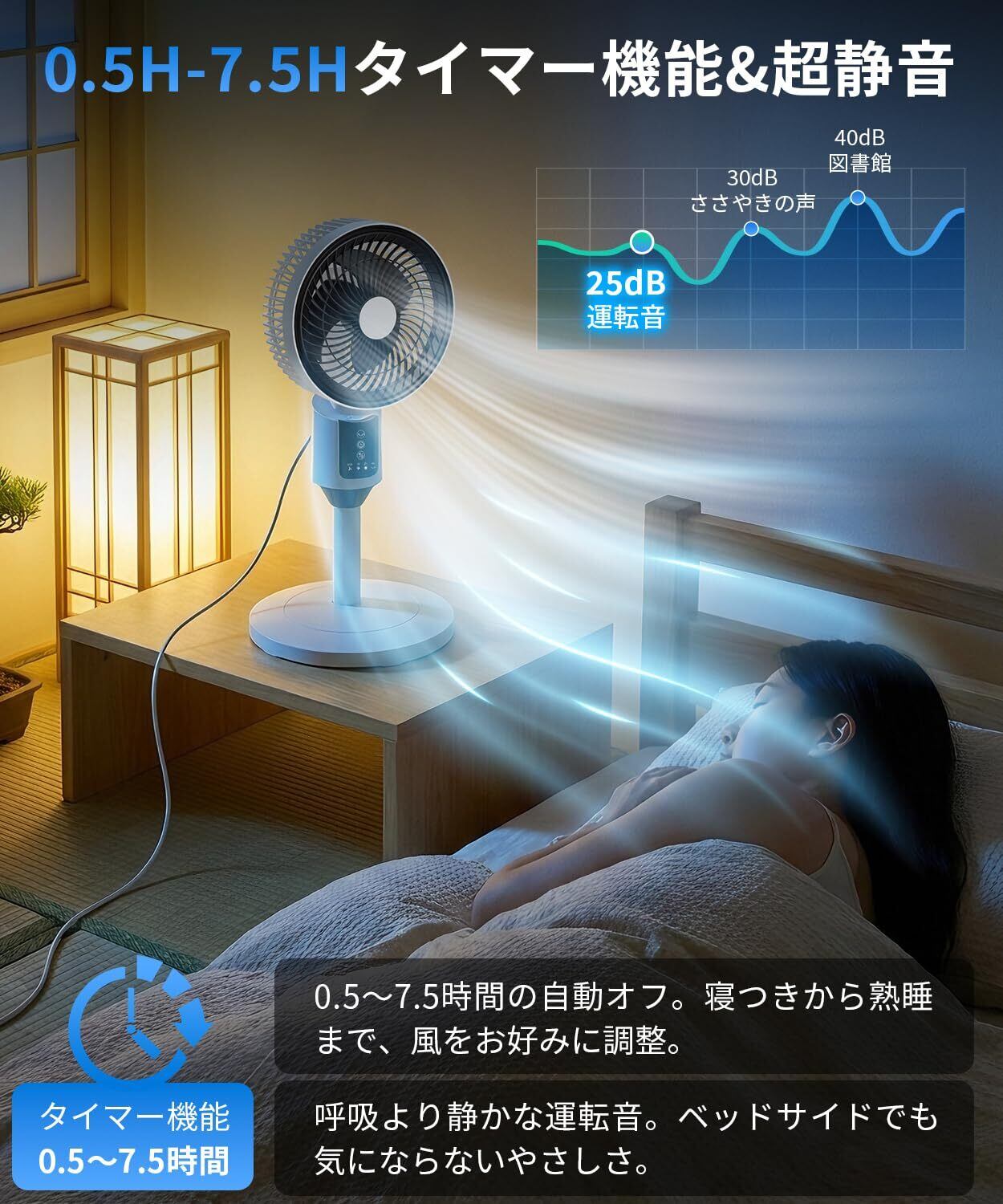 【4 段階風量&省エネ DC モーターで、静かさとパワーを両立】高性能な DC モーターを搭載し、4 段階で風量を細かく調節可能です。0.5-7.5Hのタイマー機能を搭載し、就寝時も安心してお使いいただけます。1 段階(弱)は図書館並みのわずか 25dB の静音設計で、お子様やご年配の方がいるご家庭でも快適にお使いいただけます。4 段階(強)ならパワフルな風を 12 メートル先まで届け、最大 20 畳の空間の空気循環を効率的に行います。従来の AC モーターと比較して約 60% の省エネを実現。実測値では、強モードで 24 時間連続運転しても消費電力はわずか約 1.08kWh。