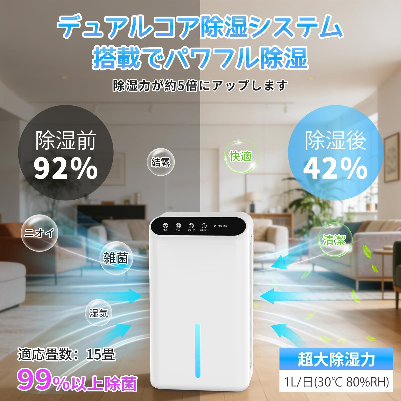 【ダブルペルチェ素子で除湿量はアップ!】2026年最新の除湿機 小型は従来のシングルペルチェ式製品に比べ、ダブルペルチェ素子を搭載し、空気接触面積が増加して除湿効果が高まり、全体で50%向上しました。 また、1日あたり1000mlの除湿が可能(気温30℃、湿度80%の場合)。 夏の梅雨時の衣類乾燥・除湿や冬の室内干しに最適、強力な除湿能力で不快な湿気を強力に取り除き、一年中快適な室内環境を実現します!
