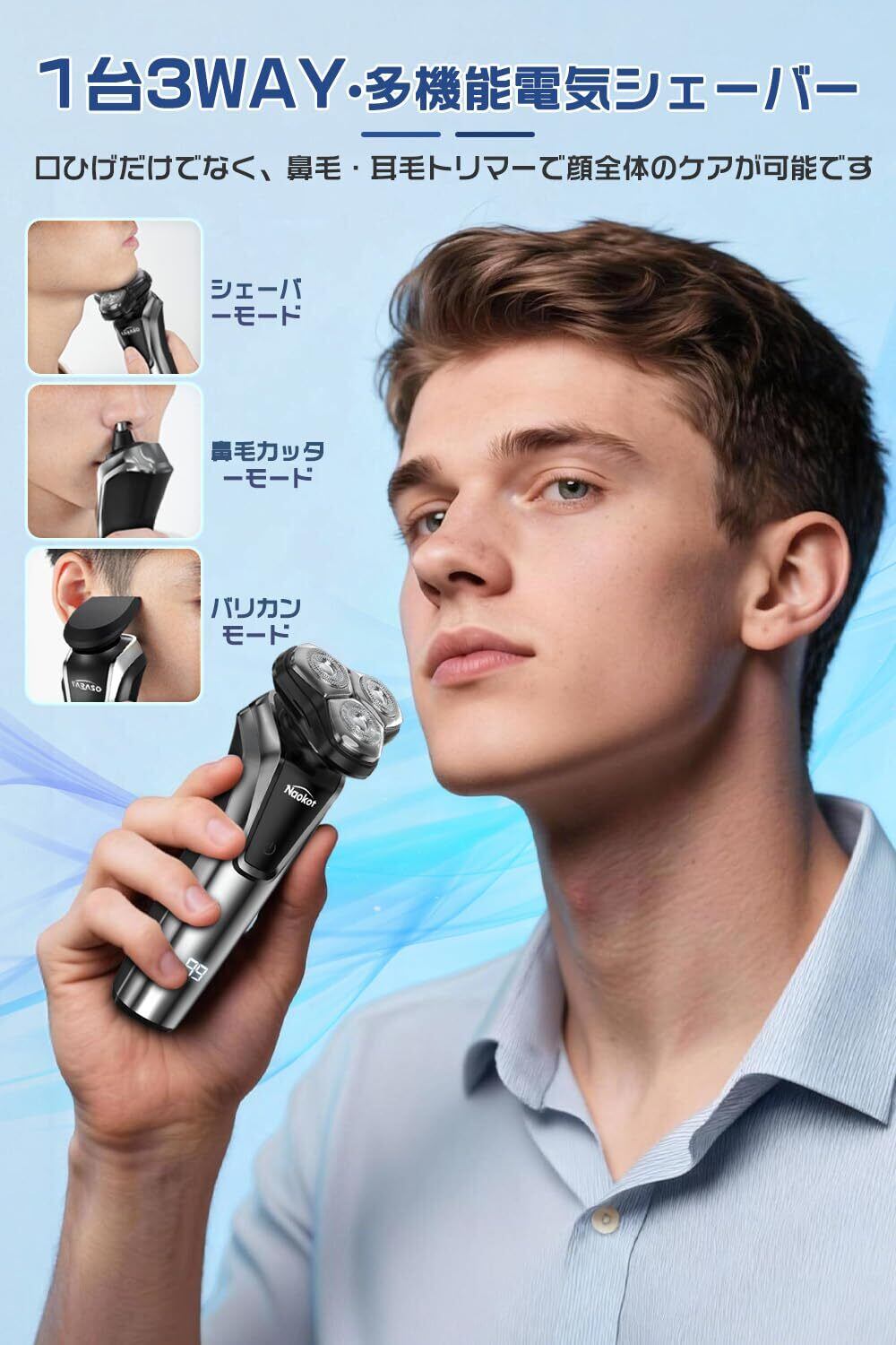 【コンパクトで持ちやすい&1台3役電気シェーバー】 メンズ シェーバーは手のひらに収まるコンパクトで握りやすいボディデザインで、疲れにくく細かい部分もラクラク操作。3in1シェーバーで、顔周りをまるごとケア、電動シェーバー・鼻毛カッター・バリカンが一体化します。ヒゲの形整えや鼻毛処理、サイドバーンまでこれ一台で完了。朝の忙しい時間帯でも効率的に身だしなみを整え、肌がさらっとした爽快感を長時間維持でき、生活リズムを向上させます。スタイルメイクの最強パートナーです。