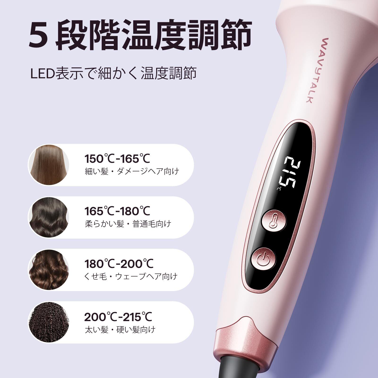【5段階温度設定&LEDディスプレイ】髪質に合わせて150℃~215℃まで、150℃/165℃は細く傷みやすい髪に、180℃は普通髪に、200℃/215℃は太く硬い髪に最適なブラシアイロン。デジタル表示付きで温度が一目で確認でき、熱ダメージを抑えながら理想のスタイルを実現します