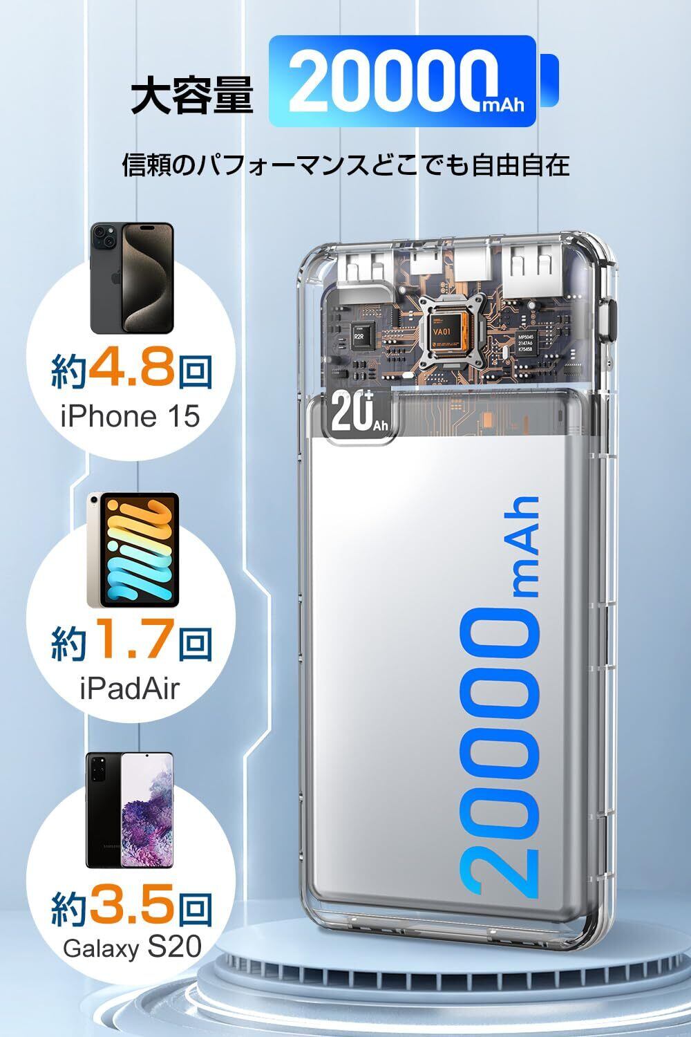 【20000mAh大容量・長時間の安心を提供】この モバイルバッテリー は、 モバイルバッテリー 20000mah の名にふさわしい大容量モデルで、スマートフォンを最大4〜5回フル充電できる圧倒的なパワーを持ちます。 モバイルバッテリーアイフォン や モバイルバッテリー アンドロイド としてはもちろん、タブレット、ワイヤレスイヤホン、スマートウォッチなどさまざまなデバイスに対応。 モバイルバッテリー 機内持ち込み可 の安全設計で、飛行機での移動時にも安心して使用できます。災害時の備えとしても信頼性が高く、 モバイルバッテリー 大容量 急速充電 を求める方に適しています。