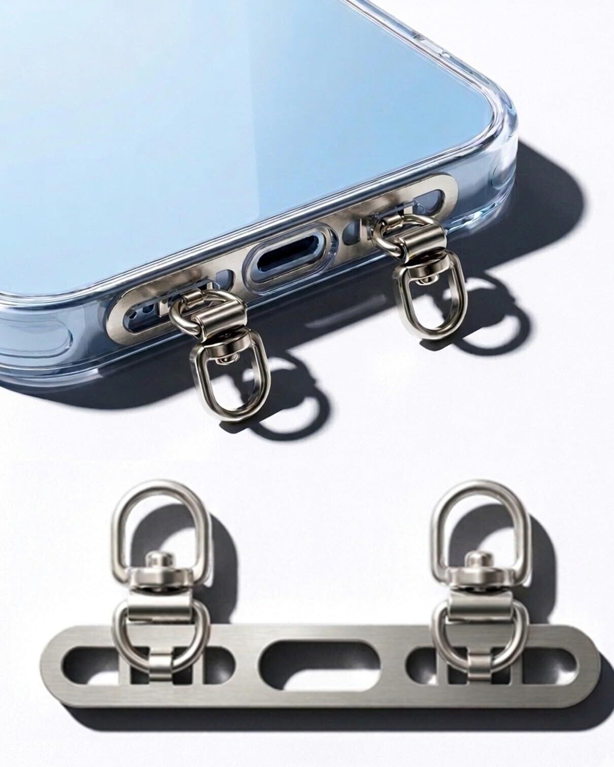 【新着商品】スマホ ストラップホルダー 2口 ステンレス 捻じれない 極薄0.4mm 充電影響なし 落下紛失防止 (シルバー)