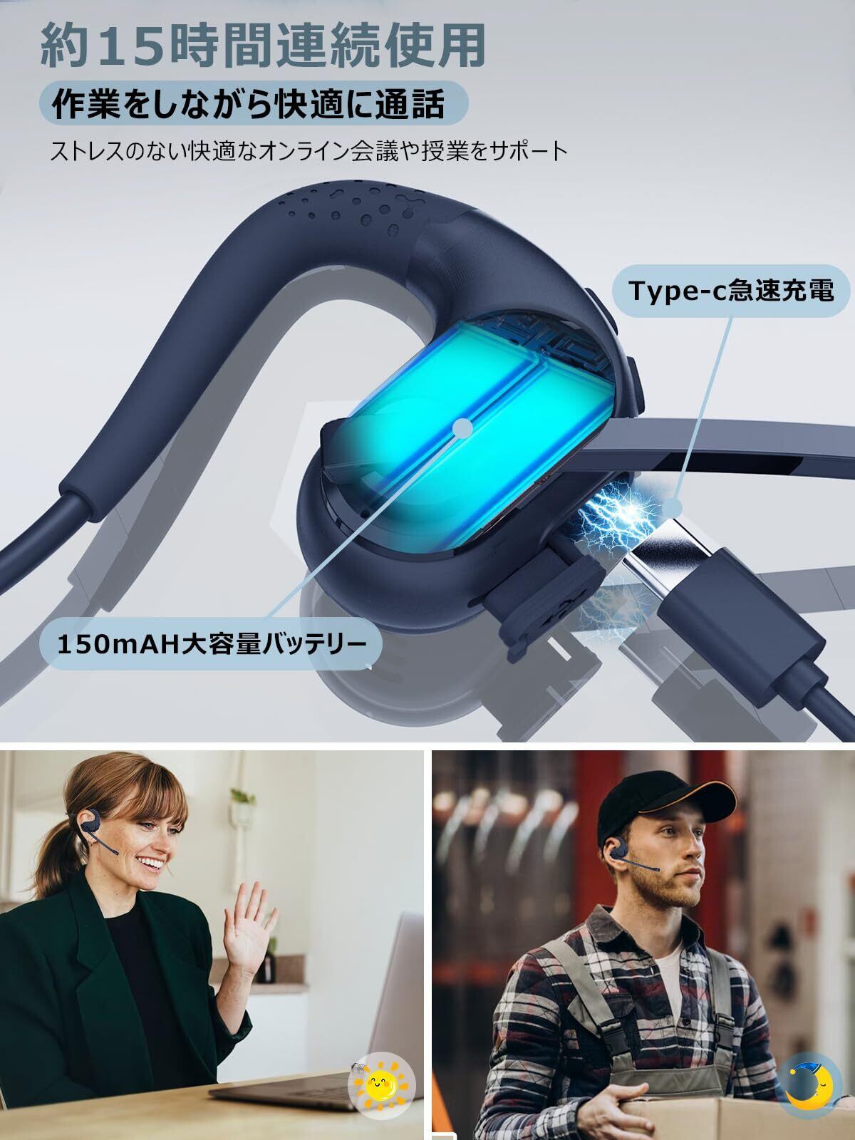 【Type-C急速充電/幅広い交換性】Tpye-C急速充電、150mAH大容量バッテリーで作業をしながら快適に通話、約15時間連続で使用できます。ストレスのない快適なオンライン会議や授業などをサポートします。幅広い交換性でSony Xpeira/Apple IOS/Android/Windows/MacOS/HUAWEI/Nexus/Asus/Galaxy/Auガラケー/OPPO/docomo系などのbluetooth搭載デバイスに対応します。商品はすべて一年付、万がー製品に初期不良があった場合、迅速に交換もしくは返品/返金の対応を承らせていただきます。また、こ不明な点やお気付きの点がごぎいましたら、お気軽に「アカウントサービス」>「注文履歴」>「販売元」>「質問する」までご連絡、ご相談ください。【ご注意:本製品をご利用するには、別途ACアタブターをご購入が必要です。必ずPSEマークの取得した正規メーカー品をご購入ください。また、充電中のご利用は禁止です。】