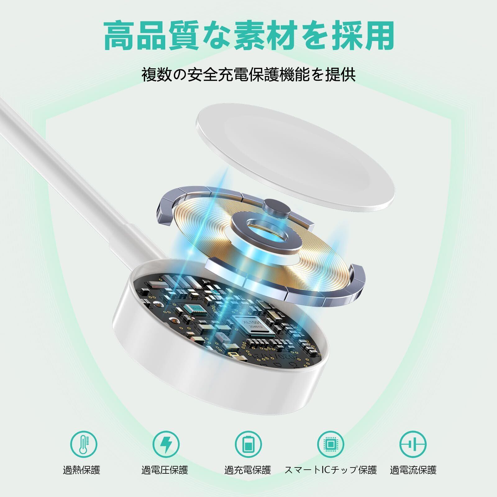【強力マグネット&多重保護】AMASUKIのアップルウォッチ充電器の中にはスマートチップとマグネットを内蔵しています。スマートチップを搭載した充電器は、過充電・過電圧・充電過熱などを防止する機能を備え、腕時計のバッテリーを保護し、ダメージから守ります。さらに、マグネット設計により、充電器を時計の充電部分に近づけると自動的にカチッと吸着。その瞬間から充電がスタートするため、面倒な端子の抜き差しは不要です。