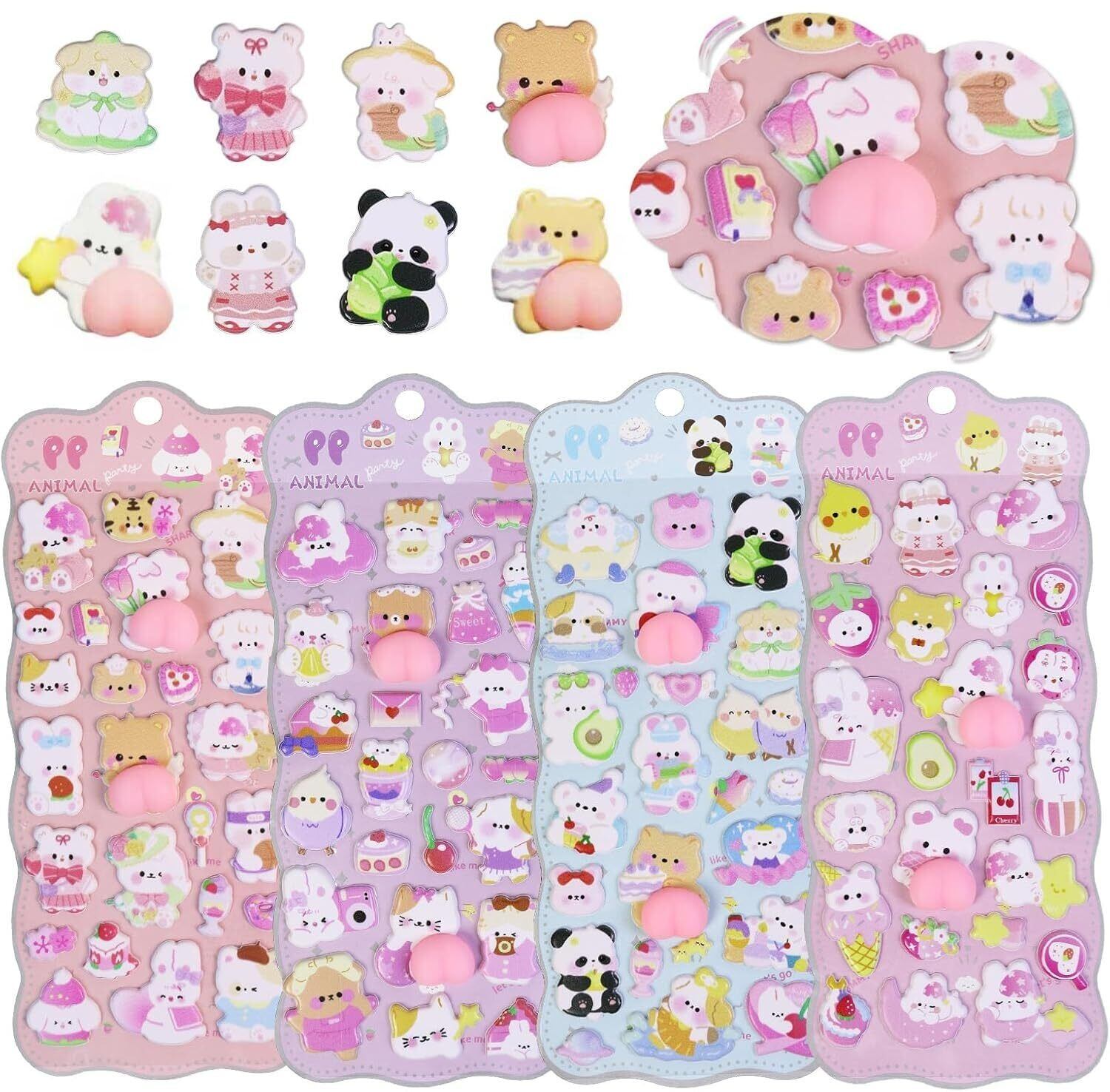kkekぷにぷにシール 立体 3D ぷくぷく 重複なし4枚セット かわいい動物キャラクター風 マシュマロ ご褒美ステッカー 手帳 ノート スマホデコ スクラップブック シール帳用 パステルカラー 子供・女の子向け 景品 プレゼント