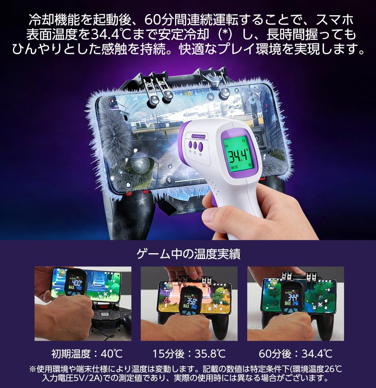 【最新改善 6本指コントローラー】半導体冷却装置付きの六本指操作スマホ用ゲームコントローラーが登場!大人気なスマホゲーム「PUBGモバイル」「荒野行動」「フォートナイト」等がよりよく楽しめます。バネ式で簡単に取り付け可能、射撃、照準、ジャンプ、伏せる、移動、歩行転換がスムーズにでき6本指同時操作可能、操作ボタンを様々なアクションに組み合わせて、勝率アップも目指せます。