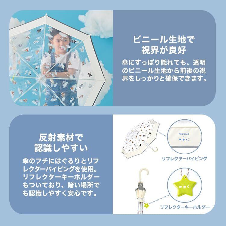 ビニール傘だから視界を遮りにくい・リフレクターパイピングやキーホルダーで夜間も目立ちやすい・開閉時に指をはさみにくい構造など、お子様に寄り添った機能を備え、可愛いだけでなく実用性もバッチリです。お揃いのレインコートとセットで「飛行犬・雨の日コーデ」を楽しんでいただくのもおすすめです。