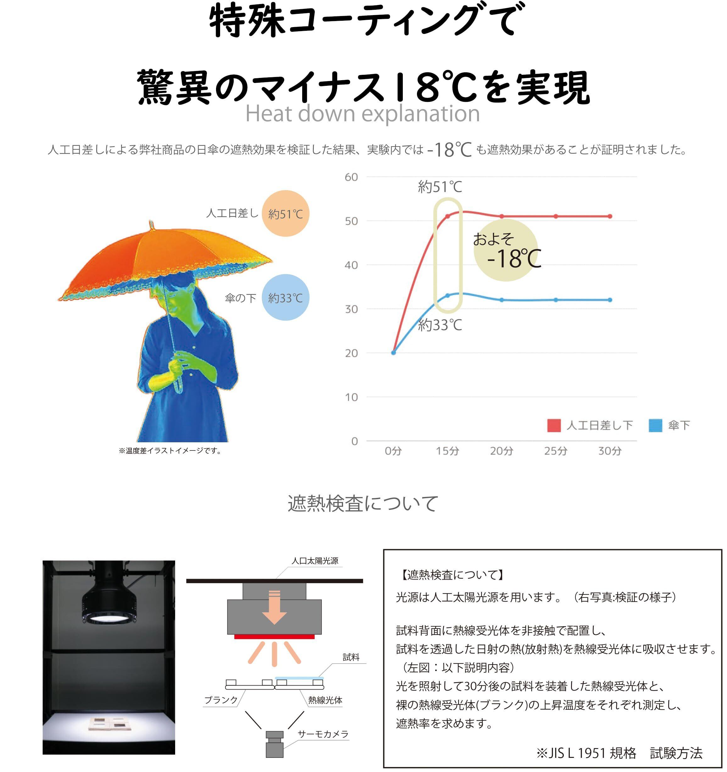 圧倒的な耐熱耐UV素材採用。内側を特殊コーティング、一級遮光でしっかり遮熱。紫外線もUV99.9%カット、UPF指数も最大の50+を実現。しっかりギラギラ太陽から守ってくれます。