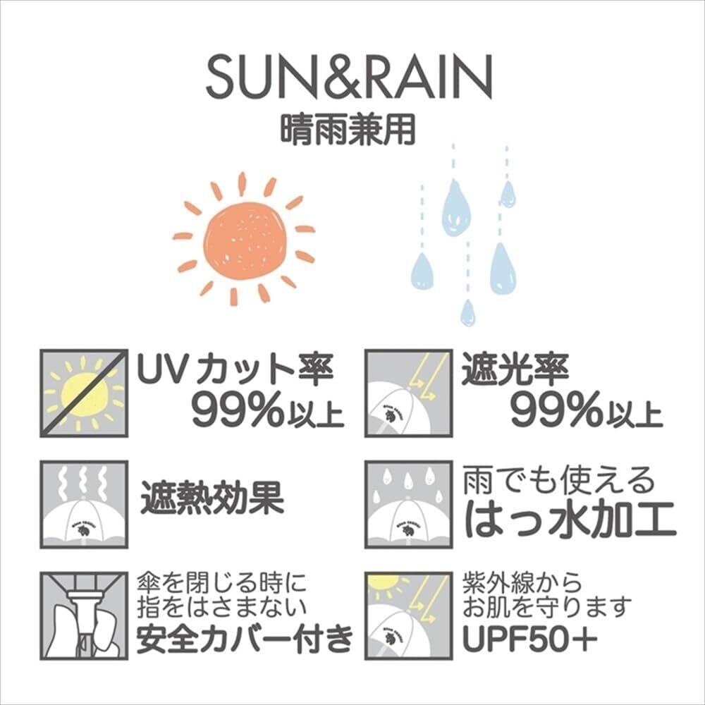 【雨の日も使える日傘】傘の生地部分は、裏面にポリウレタンコーティングがしてあり、UVカット、遮熱遮光加工もばっちり。はっ水加工も施されているので、雨の日でも使える日傘になっています。なお、使用している生地は、第三者機関により、高い遮光性やUVカットの効果、遮熱効果などが証明されております。