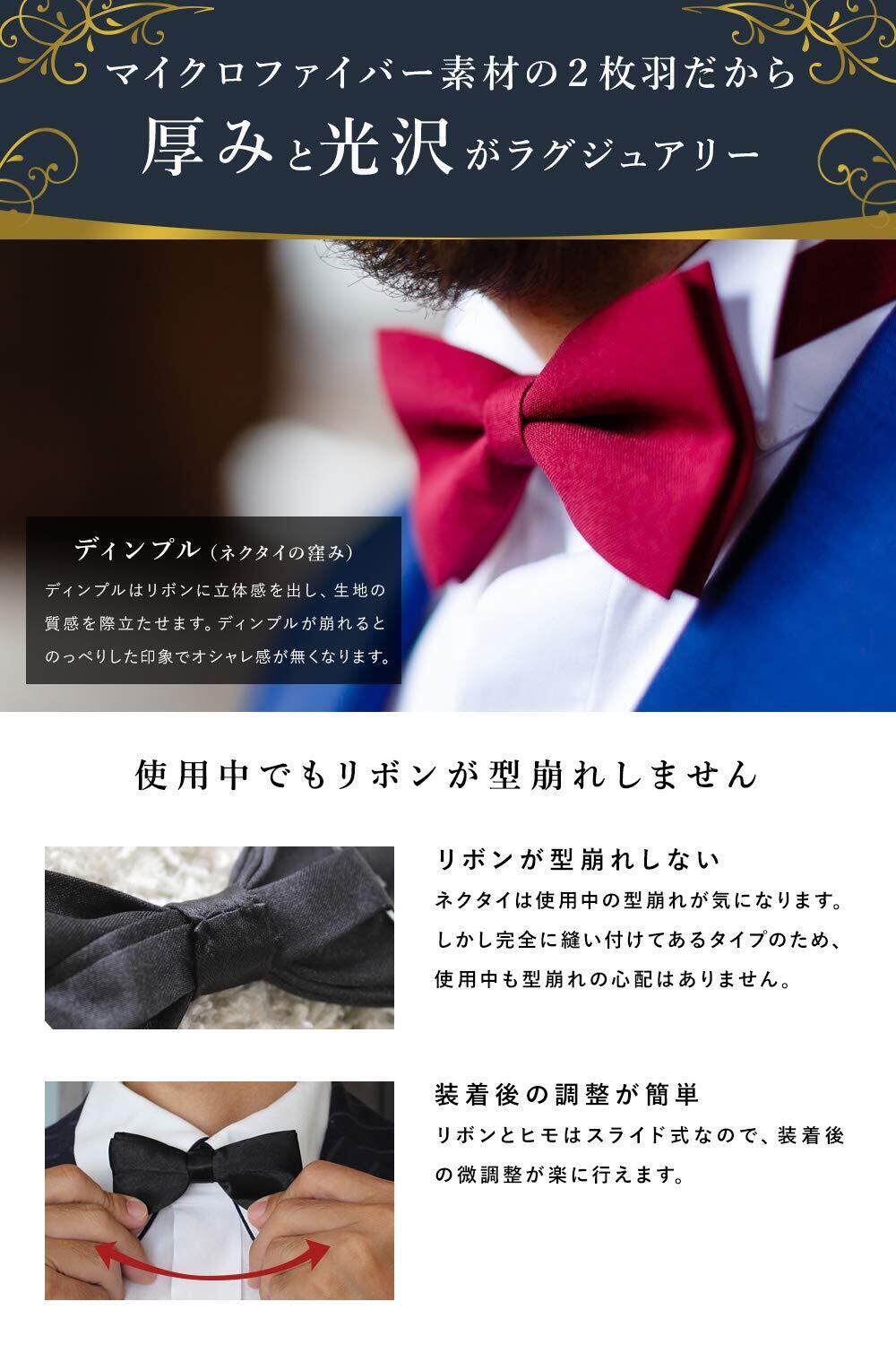 蝶ネクタイは自分で結ぼうとすると中々上手に結べません。本製品は蝶部分が糸で縫い付けて固定され、紐部分をフックで装着出来るようにしたワンタッチタイプの蝶ネクタイです。初めての方でも簡単に装着できます。