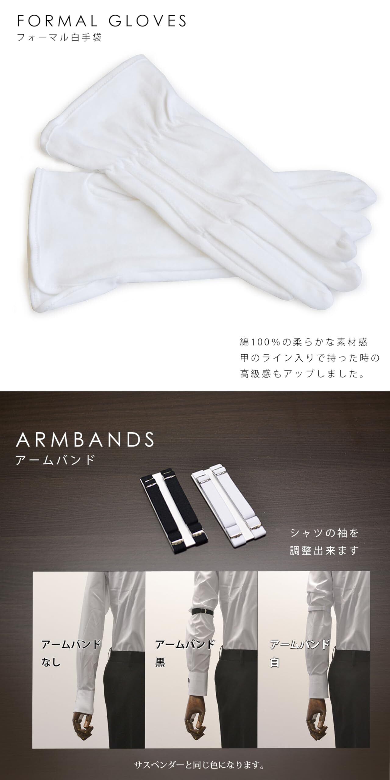 結婚式に必要なフォーマル小物がセットになった最強コスパ商品です。カフスボタン、アームバンド、サスペンダー、手袋まで揃います。ウイングカラーシャツが細かくサイズを選んで購入可能です。首回りは37㎝のSサイズから2cm単位で最大47cmの4Lサイズまで、ゆき丈(※肩から腕の長さ)のバリエーションで体形に合わせたサイズをお選びいただけます。