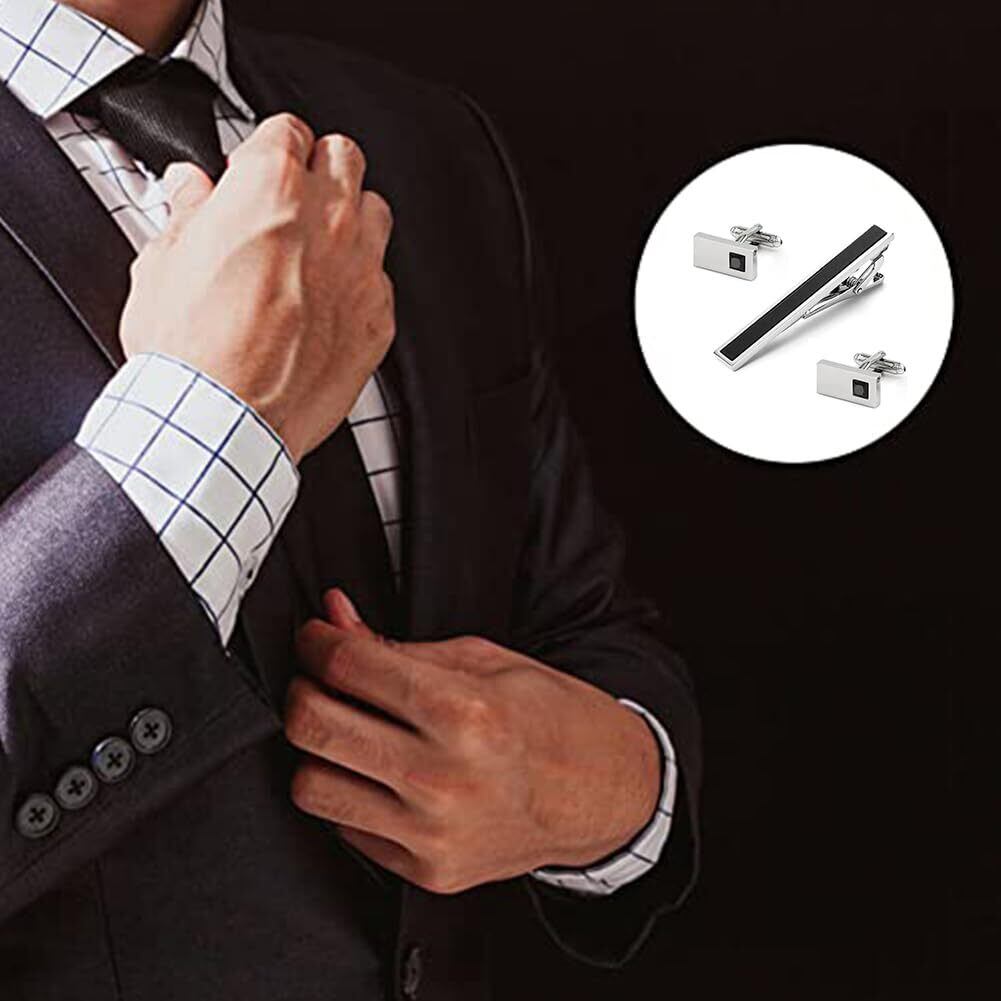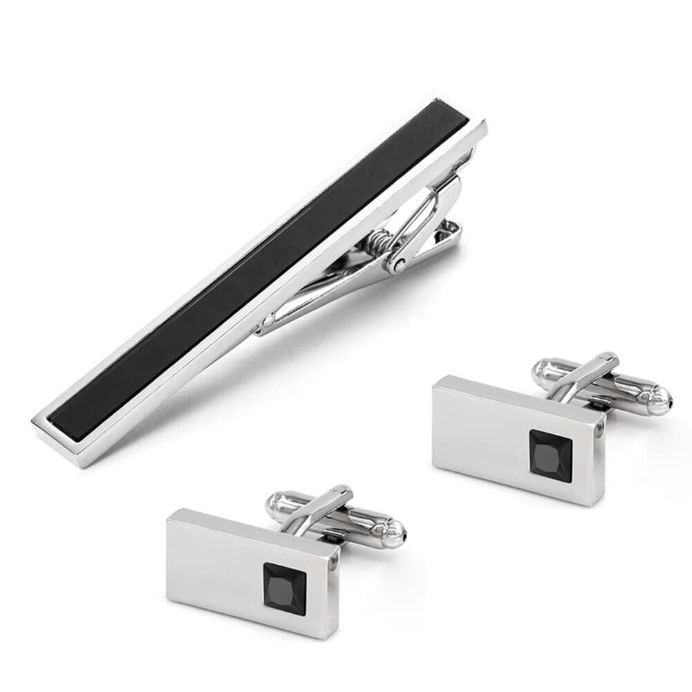 Rockyu ネクタイピン カフス セット 結婚式 おしゃれ 黒ジルコニア 一粒タイピン 長方形カフスボタン ワニロ式ネクタイピン 光面 ビジネス 就職祝い 父の日プレゼント ヨーロッパ風 カフリンクス ファッション アクセサリー