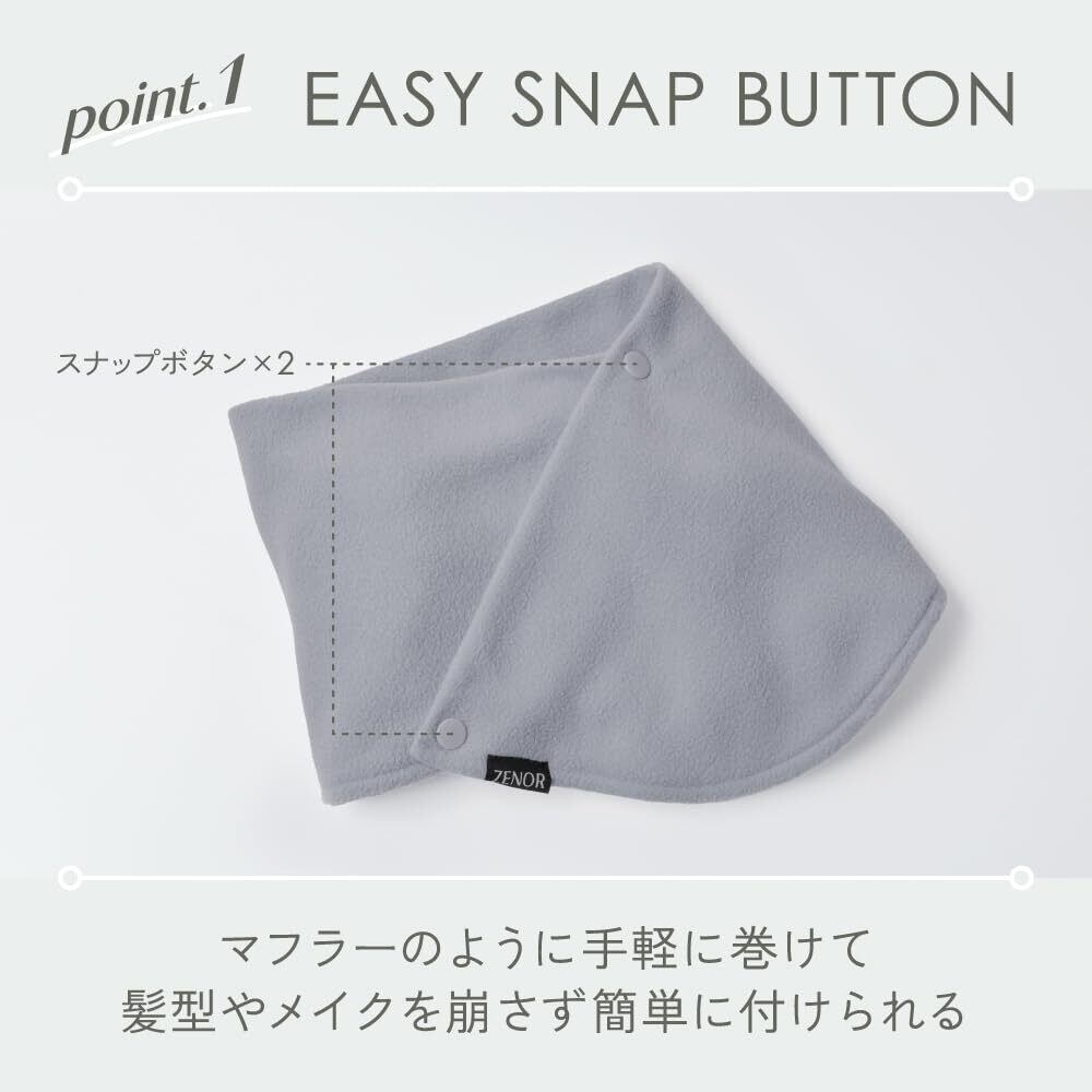 ▸【EASY SNAP BUTTON】 スナップボタン仕様で、マフラー感覚の着用が可能。 頭を通さないため、ヘアセットやメイクを崩さず着脱できます。 外出時や移動中でもストレスなく使える設計です。