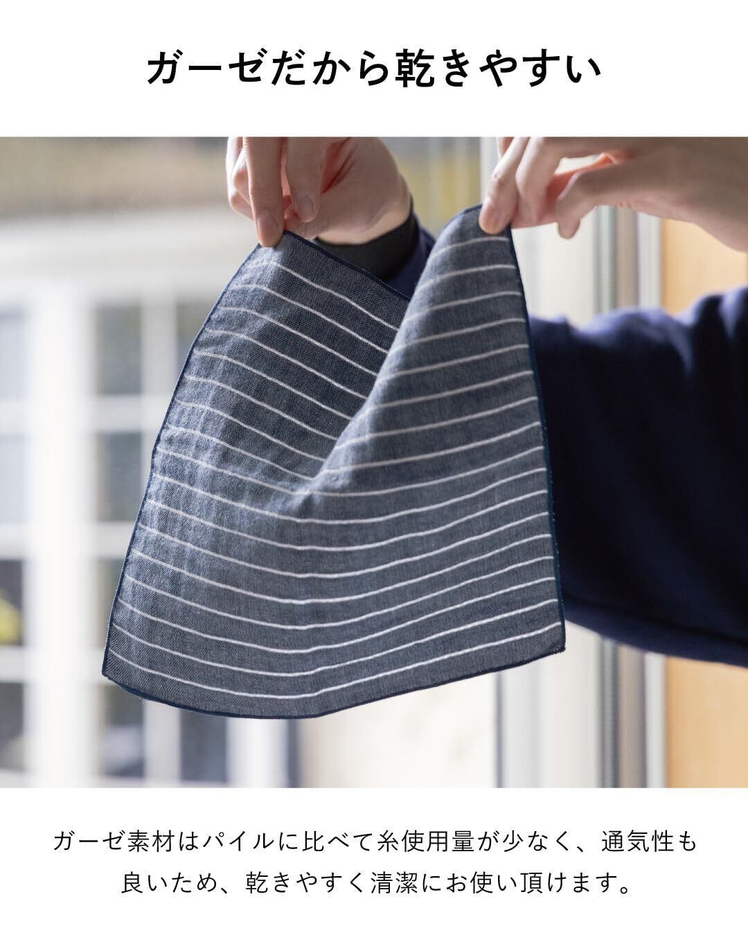 【ガーゼだから乾きやすい】ガーゼ素材はパイルに比べて糸使用量が少なく、通気性も良いため、乾きやすく清潔にお使い頂けます。