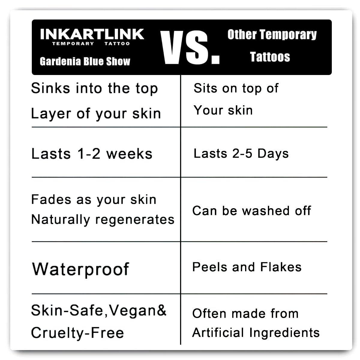【肌への安全性】 INKARTLINKの一時的タトゥーは天然植物から作られており、肌への安全性は全く問題ありません!INKARTLINKは有害な化学物質を含まない「ガーデニアブルーショー」を成分として使用しています。 注意:アルコール、マンゴー、ピーナッツ、その他の植物成分にアレルギーのある方は使用しないでください! 顔、傷口、敏感肌には使用しないでください!