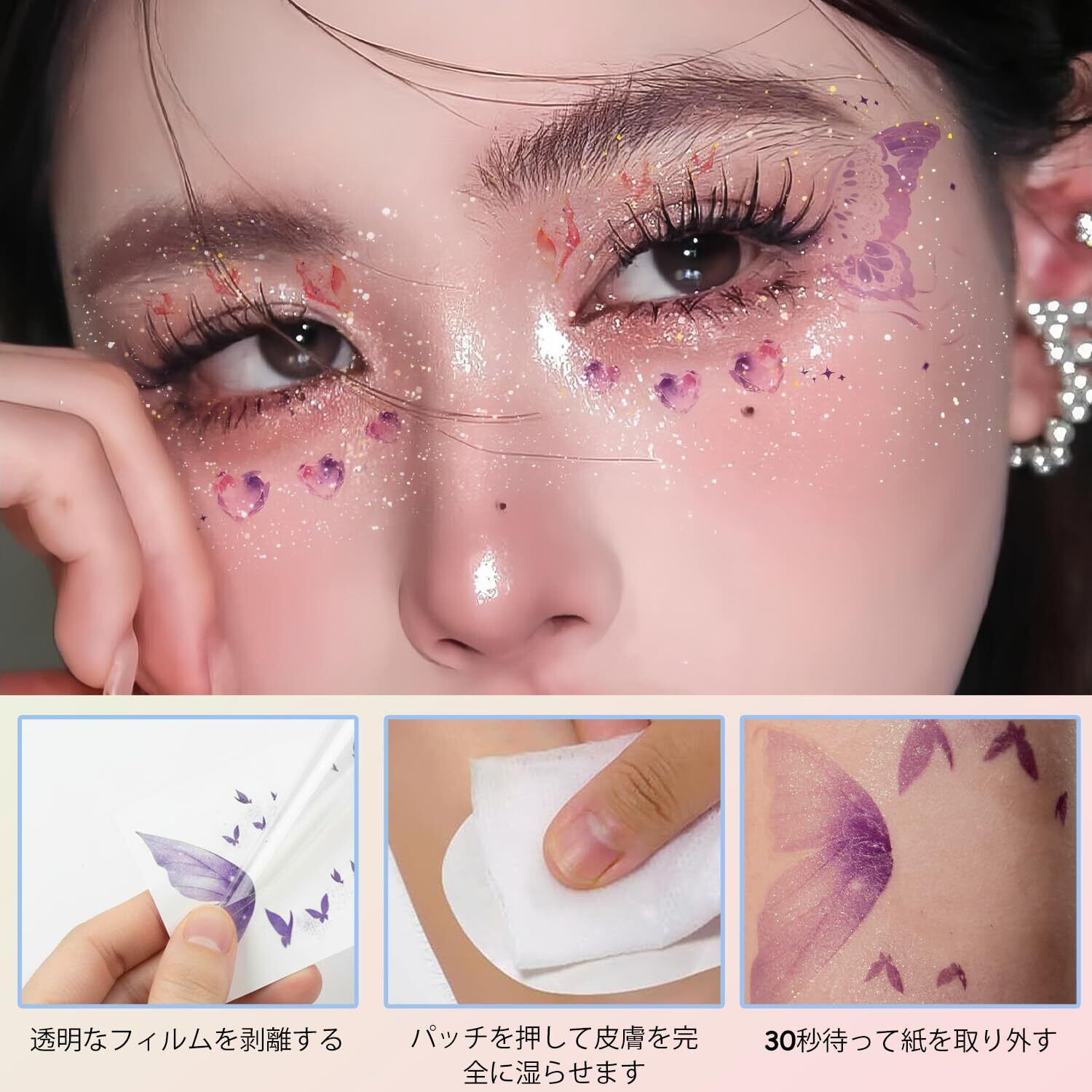 撥水性と防汗性に優れてい:水泳、スポーツ、日常の活動のいずれの場合でも、キラキラ輝く顔のタトゥーがぴったりフィットし、色が鮮やかで落ちないことがされます。どんなパーティーやイベントでも持ちこたえ、何時間も輝きと美しさをキープできます。