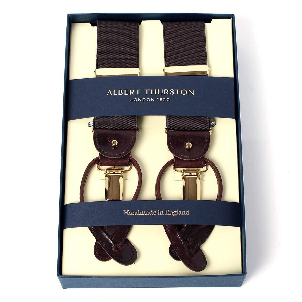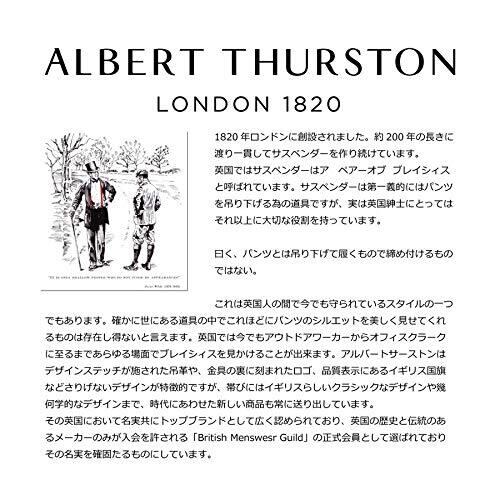 【ALBERT THURSTON アルバート・サーストン】 1820年創業以来、英国紳士や世界の著名人に今も尚、愛され続けているサスペンダーのトップブランド。 今では高級紳士服アクセサリーの代名詞となり、世界中のVIPに愛用され、今でも多くの人々に愛されています。 創業当時から自社工場で一貫して生産しており、今も品質維持をテーマに掲げ、昔と変わらないクオリティの製品を供給し続けています。