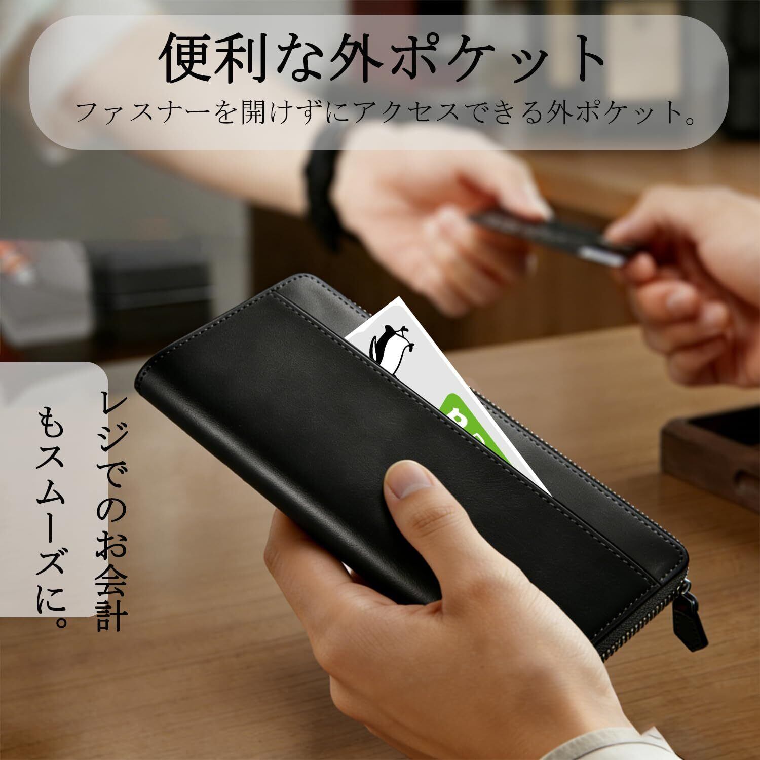 【左右対称の美しいデザイン】左右対称構造により、視覚的な美しさと高い操作性を実現。開いた際、左右どちらの手でも同じ感覚でカードや紙幣にアクセスできるため、利き手を問わず快適にお使いいただけます。ラウンドファスナー長財布の程よい厚みが、シャープな印象と確かな存在感を演出。手に持っても様になる重厚なフォルムがこのスマートウォレットの人気の秘訣です。持ち歩いても、バッグに入れても様になる、上質な革の質感が魅力です。