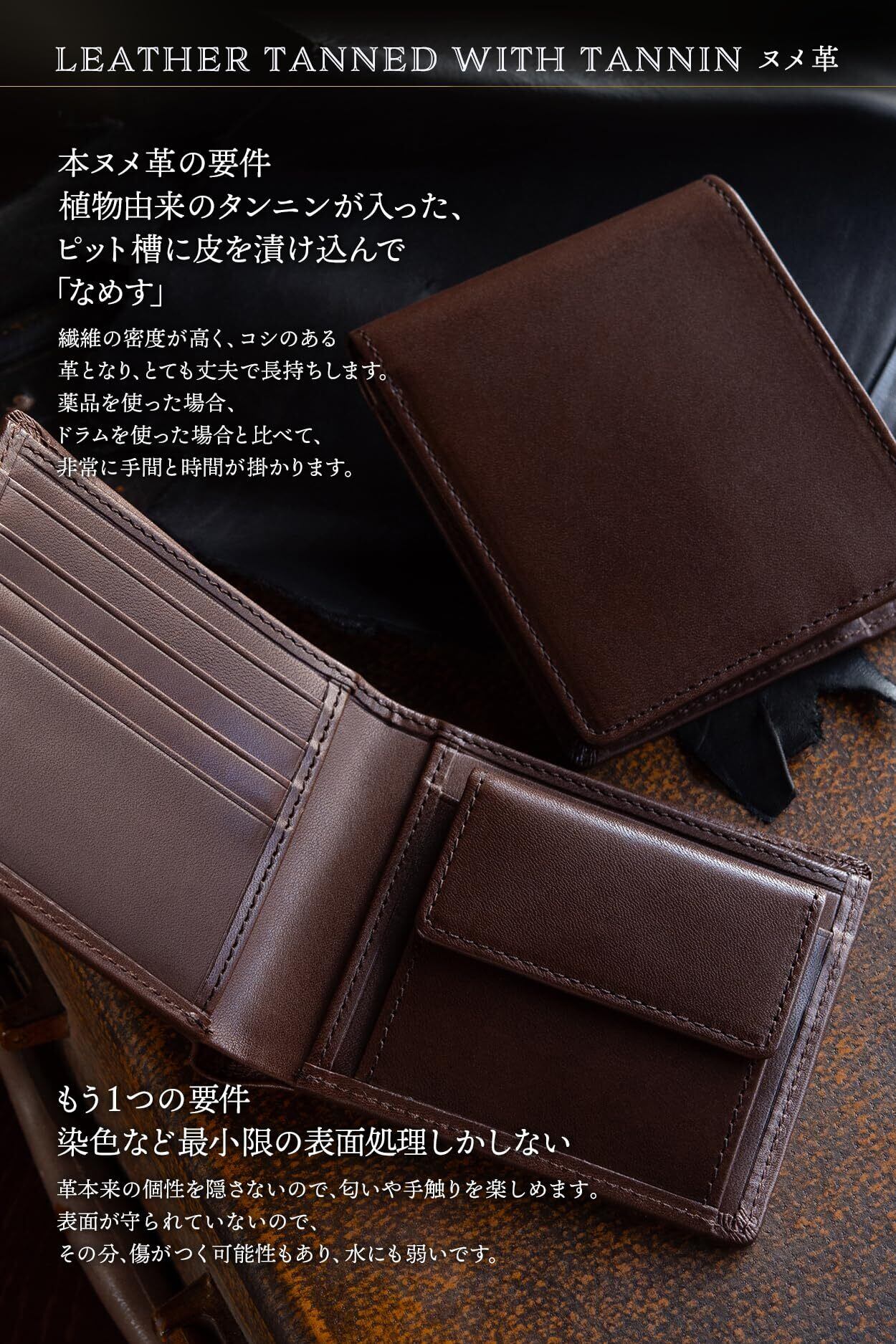 【ブランド】 革師RE-MEN’S/【商品名】 『革師の二つ折り』(栃木レザー)/ 【素材】栃木レザー株式会社のヌメ革 / 【カラー】 5通り(ブラック、ダークブラウン、ネイビー、キャメル、グリーン)