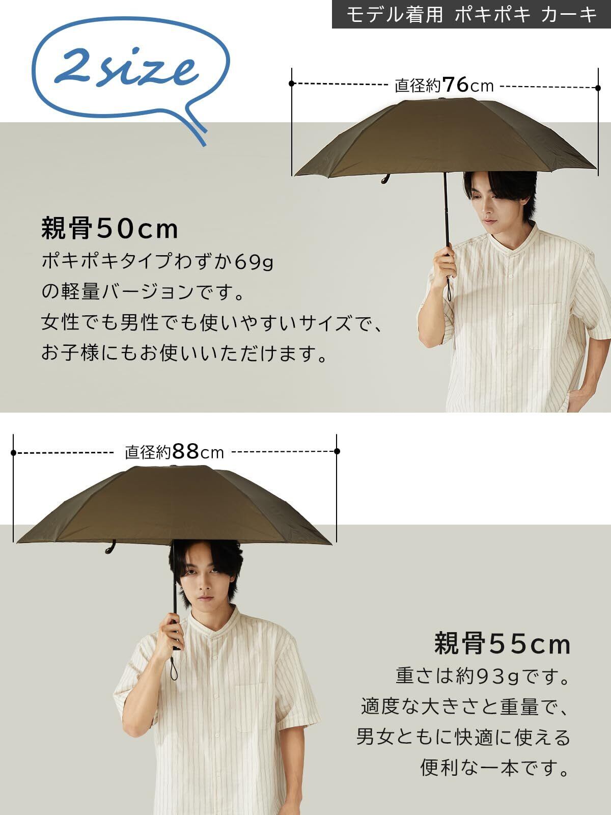 【選べる2サイズ・幅広く使える】2サイズを用意しておりますので、男女問わず、子供から大人まで幅広くお使いいただけます。親骨50cm:重さは約69gで、直径は約76cmで、折りたたむ時の長さは20.5cmです。男女ともにご愛用いただけるアイテムで、子どもにもぴったりです。親骨55cm:重さは約93gで、直径は約88cmで、折りたたむ時の長さは22cmです。軽量を維持しながら、カバー範囲を広げました。適度な大きさと重量で、男女ともに快適に使える便利な一本です。ニーズにあわせてご利用いただけます。(カラー・商品ごとに多少差異がございますこと予めご了承ください。)