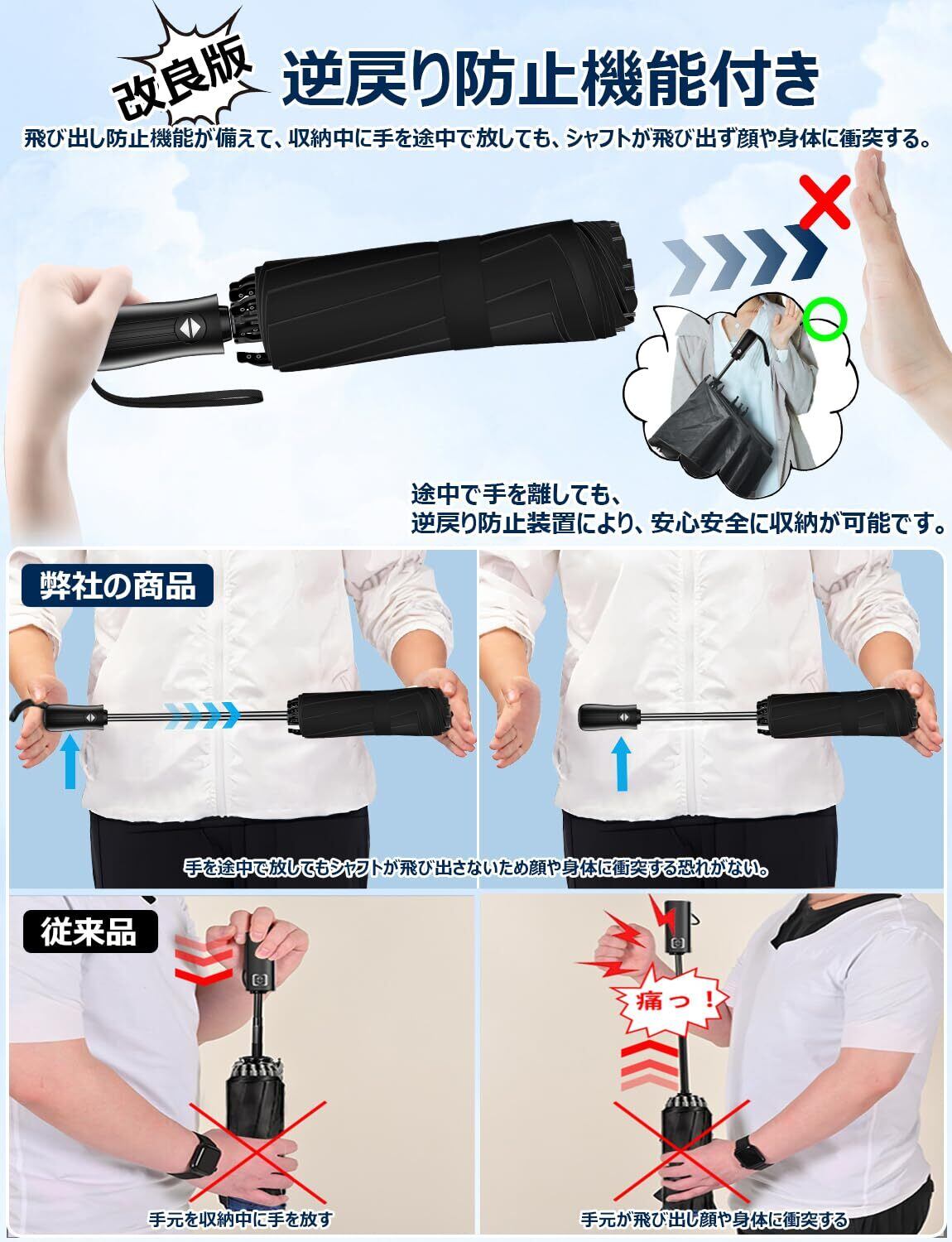 【逆戻り防止安全設計傘】✿一般的な自動開閉式折りたたみ傘はシャフトを縮める際、一気に押し込まなければバネが逆戻りして危険です。の自動開閉傘は自動開閉機能に不意な飛び出しを防ぐセーフティシャフト搭載で、一般的な自動開閉折りたたみ傘より安全に閉じられます。逆戻りしない安全式自動開閉傘は途中で手を放しても飛び出さずに、どこでも止まります!︎不意な飛び出しを防止し、段階的に収納可能なので、顔や体に衝突するおそれがなくなり、安全性が大幅に向上した折りたたみ傘です。地面や壁に当てなくても、両腕の力だけでも仕舞えるので、男性はもちろん、女性やご年配の方でも安全・簡単に操作できます。