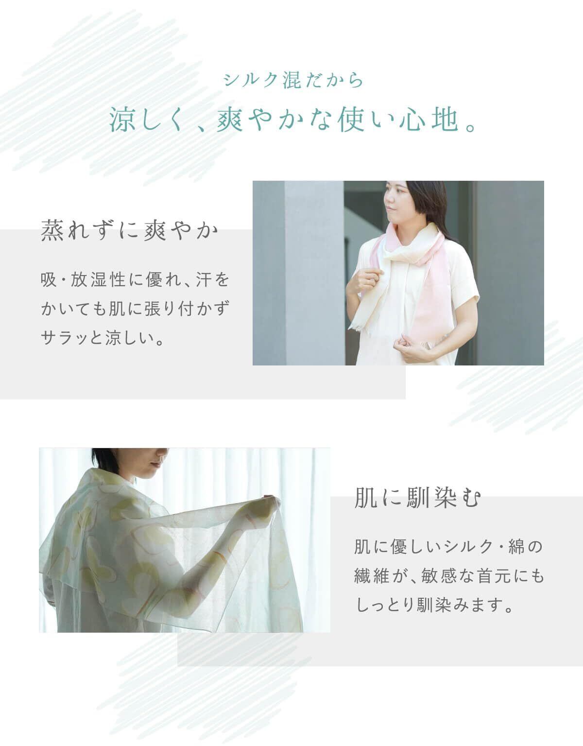 【シルク使用でお肌に優しい】●やわらかく敏感肌にも優しい。 ●余分な汗を吸って蒸れない。 ●紫外線の肌ダメージを軽減。 シルクと綿の糸を交互に織ることによって、綿のやわらかさとシルクの滑らかさのある、肌当たりの優しいストールができました。天然繊維100%で肌に優しく、多くの方に快適にご使用頂けます。