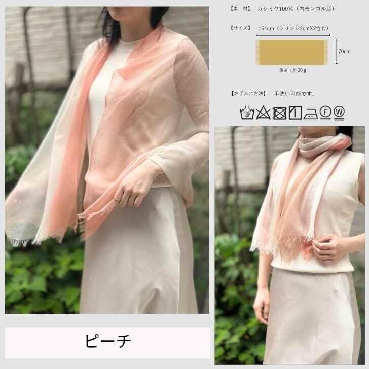 【素材】カシミア100%(内モンゴル産)【サイズ】幅70cm×長さ154cm(本体150cm・フリンジ2cm×2) 約30g 【お手入れ方法】手洗い可能です。中性洗剤でできるだけ短い時間で水で優しく押し洗いしてください。すすぎ後は乾いたタオルで水気をとり陰干しをし、乾いた後のシワはあて布をして中温アイロンをかけてください。乾燥機での乾燥はお避けください。【着用時の注意】非常に繊細な糸を使ったデリケートな商品です。引っかかりに気をつけてご使用ください。