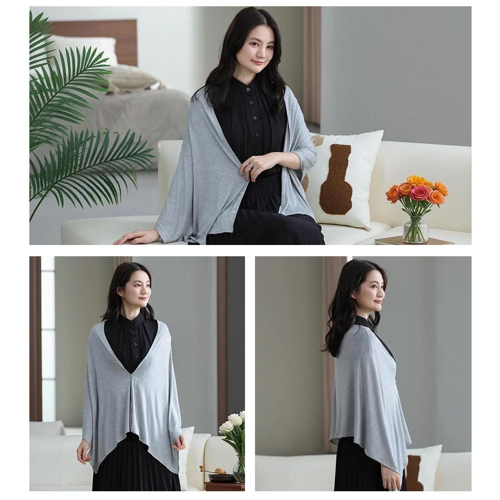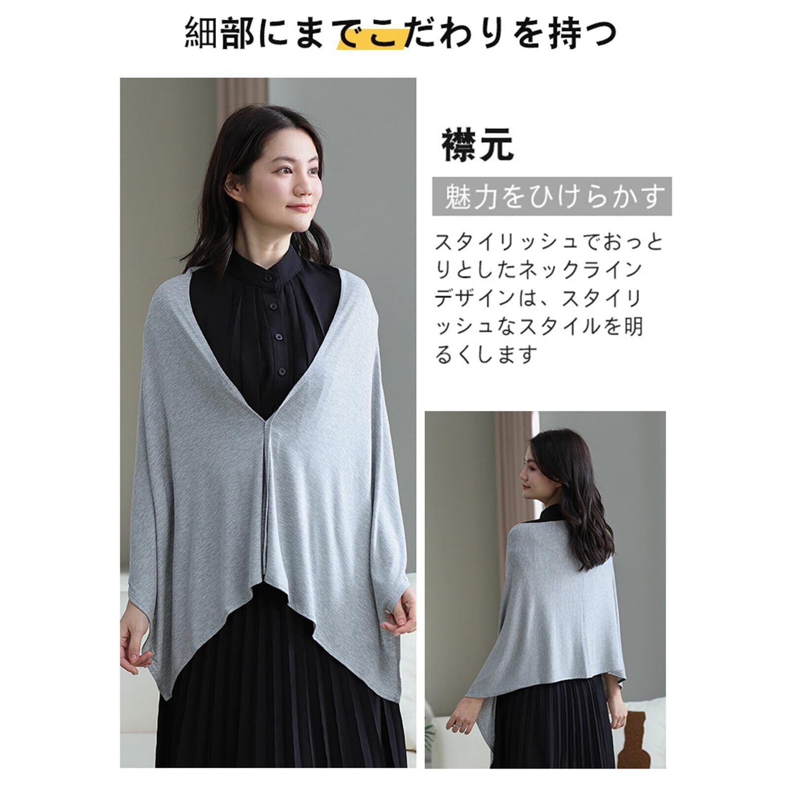 多様な使い方ができる多機能デザイン:肩に羽織ってショールとして、首に巻いてストールとして、ひざ掛けとしても使える万能アイテム。シーンやコーデに合わせて自在にアレンジできます。