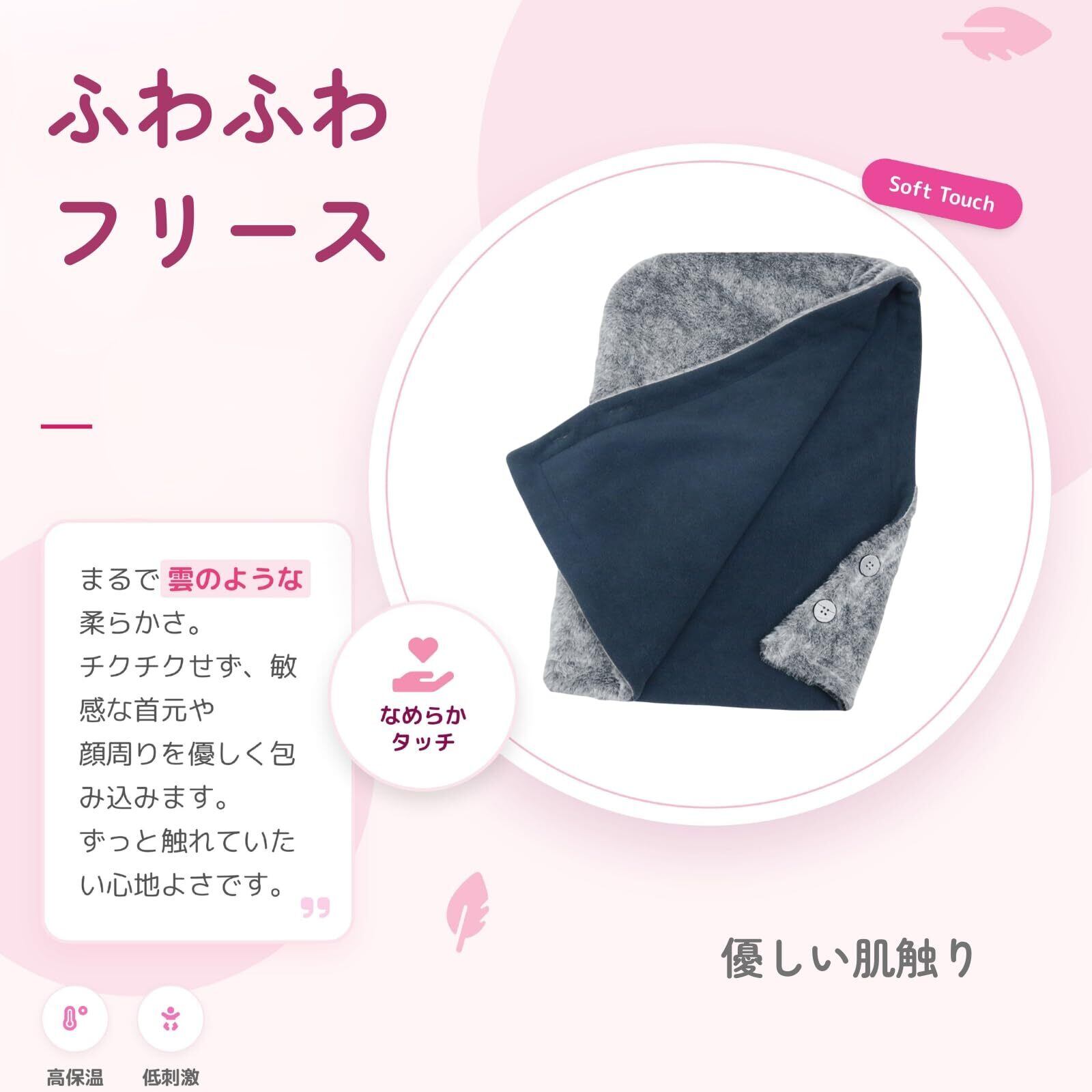 【デリケートな首元を癒やす、ふわふわフリース】直接肌に触れるものだからこそ、ふわふわもこもこ素材の柔らかさにこだわりました。。チクチク感や締め付けがないので、首元が敏感な方でも違和感なく朝までリラックス。優しい肌触りが、一日の終わりに心身の緊張を解きほぐしてくれます。