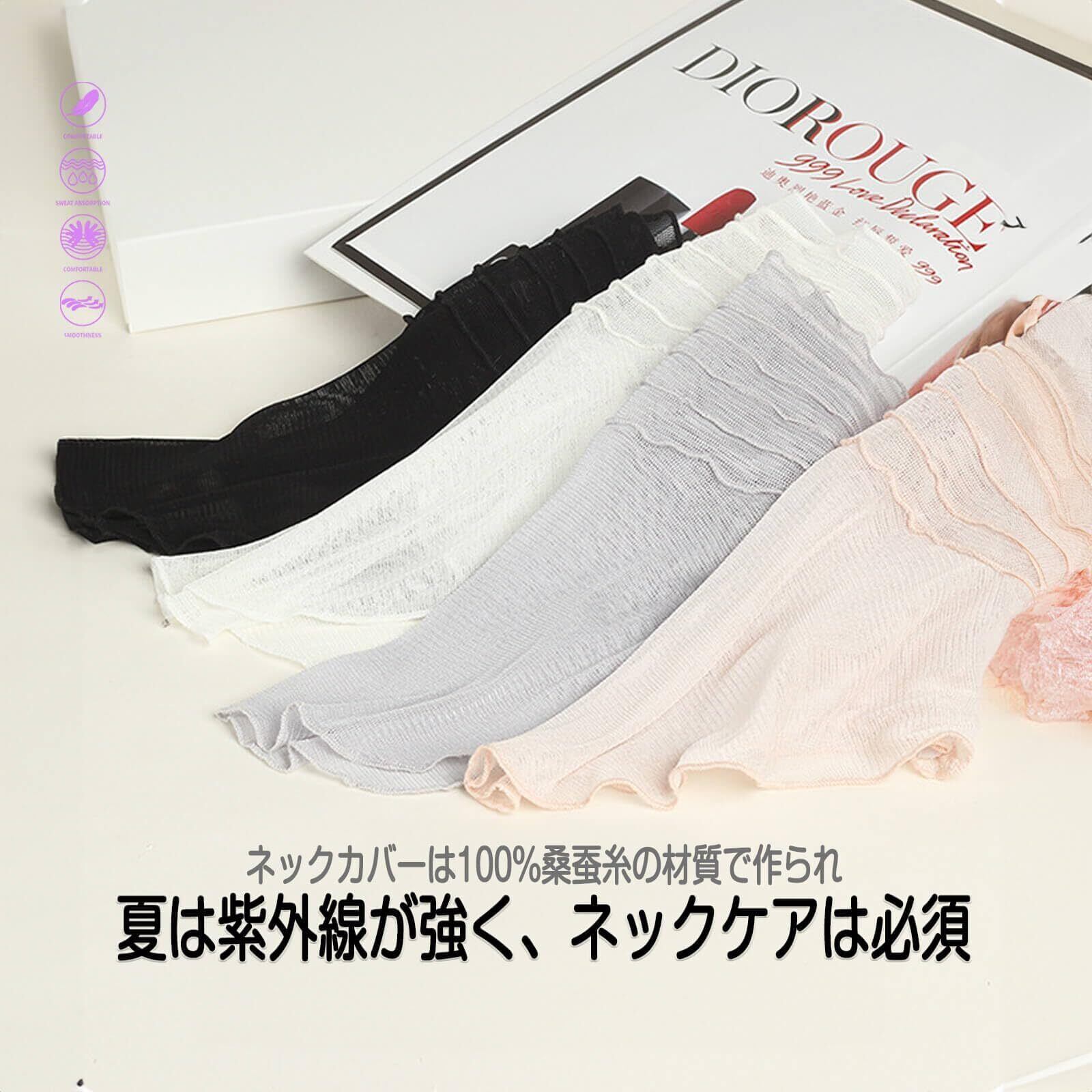 【ネックカバー】夏の強い日差しから首元を守る必需品。100%シルク生地は吸汗性に優れ、常にサラサラ感を保ちます。ストレッチチュールネット素材を採用しているため、夏でも快適に日差しを遮り、オシャレに日焼け防止。