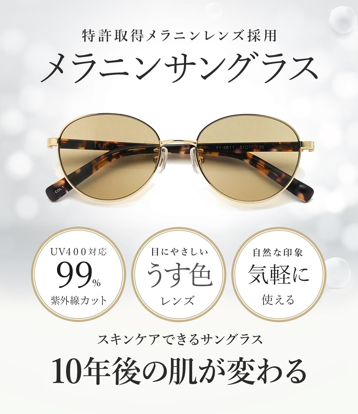 メラニンサングラス レディース UV400取得メラニンレンズ/肌に優しいアセテート製/UVカット ブルーライトカット/運転 ドライブ対応 EY-S609