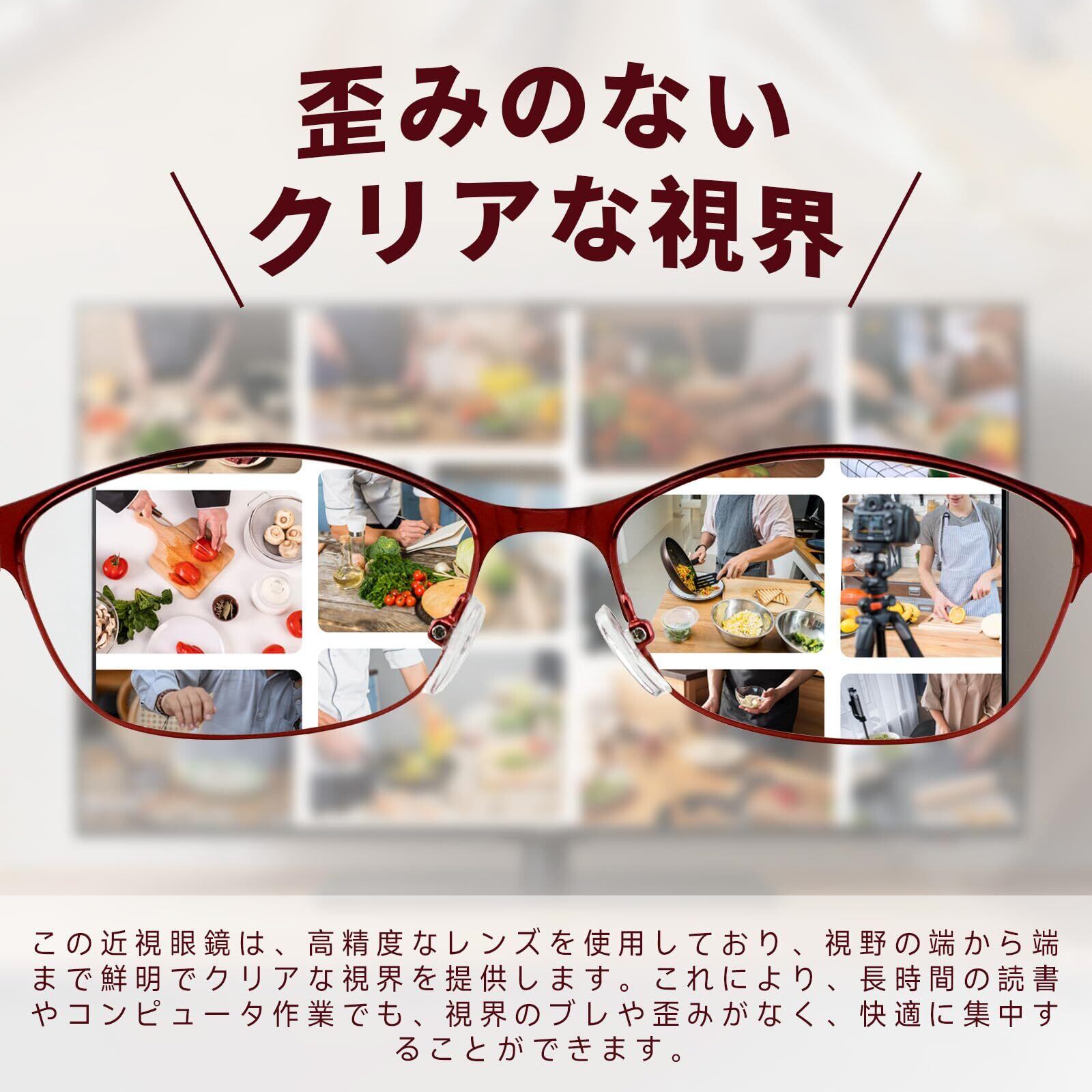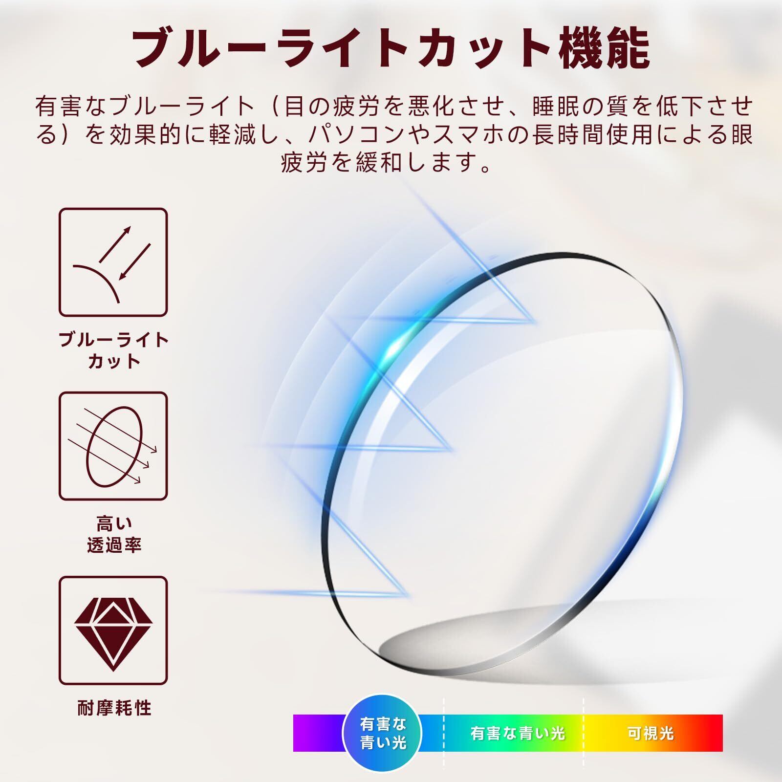 歪みのないクリアな視界►この眼鏡は、高精度なレンズを使用しており、視野の端から端まで鮮明でクリアな視界を提供します。これにより、長時間の読書やコンピュータ作業でも、視界のブレや歪みがなく、快適に集中することができます。さらに、レンズの表面には特別なコーティングが施されており、反射やグレアを効果的に抑え、目にかかる負担を最小限に抑えます。