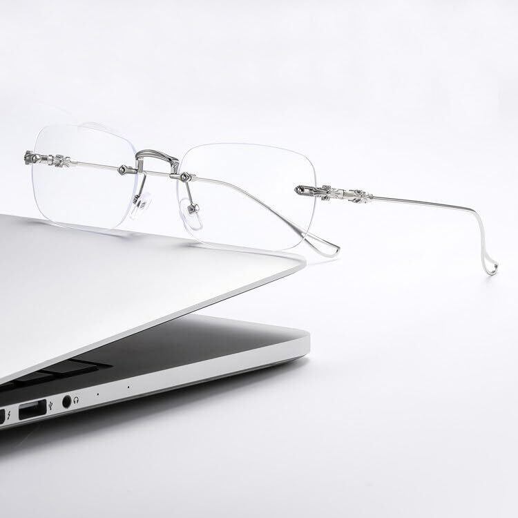 【商品】リムレスメガネ(韓国トレンド) 【色とサイズ】シルバー フレーム幅:約146mm テンプル長さ:約145mm ブリッジ:約20mm レンズ幅:約56mm レンズ高さ:約37mm 韓国ファッション好きな女性にぴったりな「リムレスメガネ」は、透明感のあるシルバーフレームが洗練された印象をプラスしてくれるアイテム。縁なしデザインで顔なじみも良く、どんなスタイルにもナチュラルに溶け込みます。軽量タイプだから、かけていることを忘れるほどの心地よさ 伊達メガネ感覚で使える度なし仕様。さらに、ブルーライトカット機能付きだからスマホやPC作業が多い毎日にもぴったりです。目元にやさしく、さりげなく可愛いを引き出してくれる嬉しい設計です ユニセックスデザインの「リムレスメガネ」は、シンプルながらもこなれ感があり、プレゼントとしても大人気。シルバーカラーが上品で、カジュアルにもキレイめにも合わせやすいのが嬉しいポイントです。おしゃれと実用性を兼ね備えた一本で、毎日をもっとスマートに可愛く楽しんでみませんか?