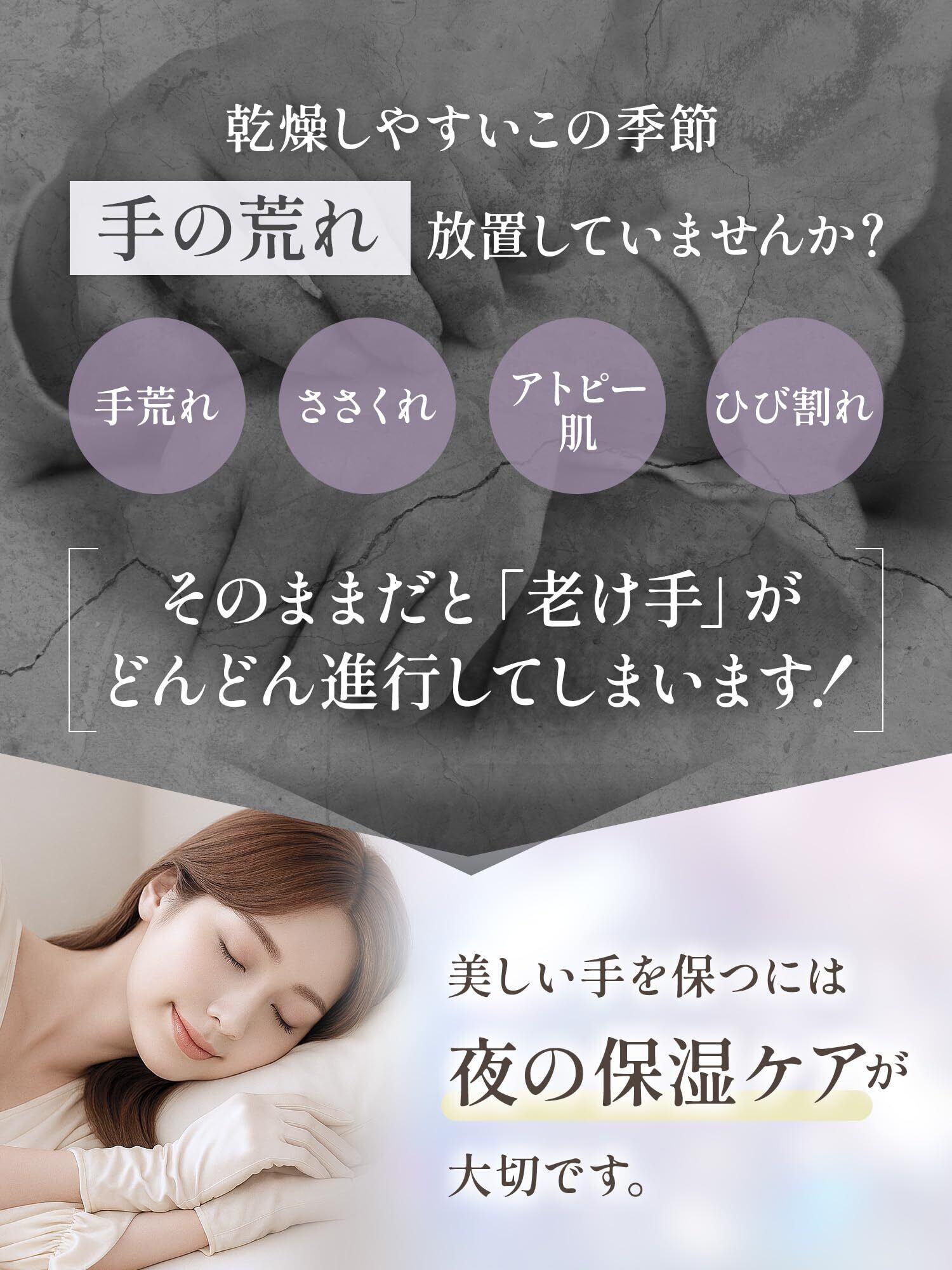 【寝ながら手荒れ対策】手荒れ や手の乾燥にお悩みのあなた。 LINOR の おやすみ手袋 を着用することで、就寝中にしっかり ハンドケア 。ハンドクリームを塗った上から ナイトグローブ として着用いただくことで、寝る時保湿剤が寝具に付着する心配なく摩擦や乾燥から手肌を守ることができます。