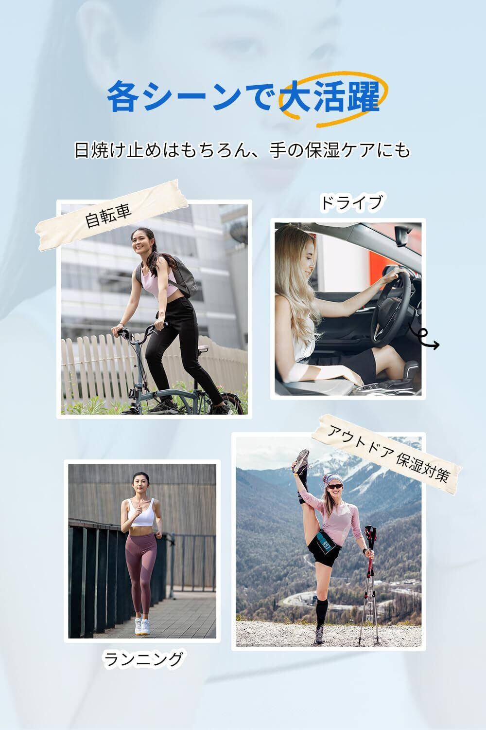 【UPF50+UVカット手袋】紫外線対策、手を保護し、日焼け止め効果抜群。紫外線98%カットから手肌を守り、夏にピッタリとするレディース用UVカット手袋です。 蒸し暑くない素材、肌に馴染むような薄手の生地で、快適なつけ心地です。