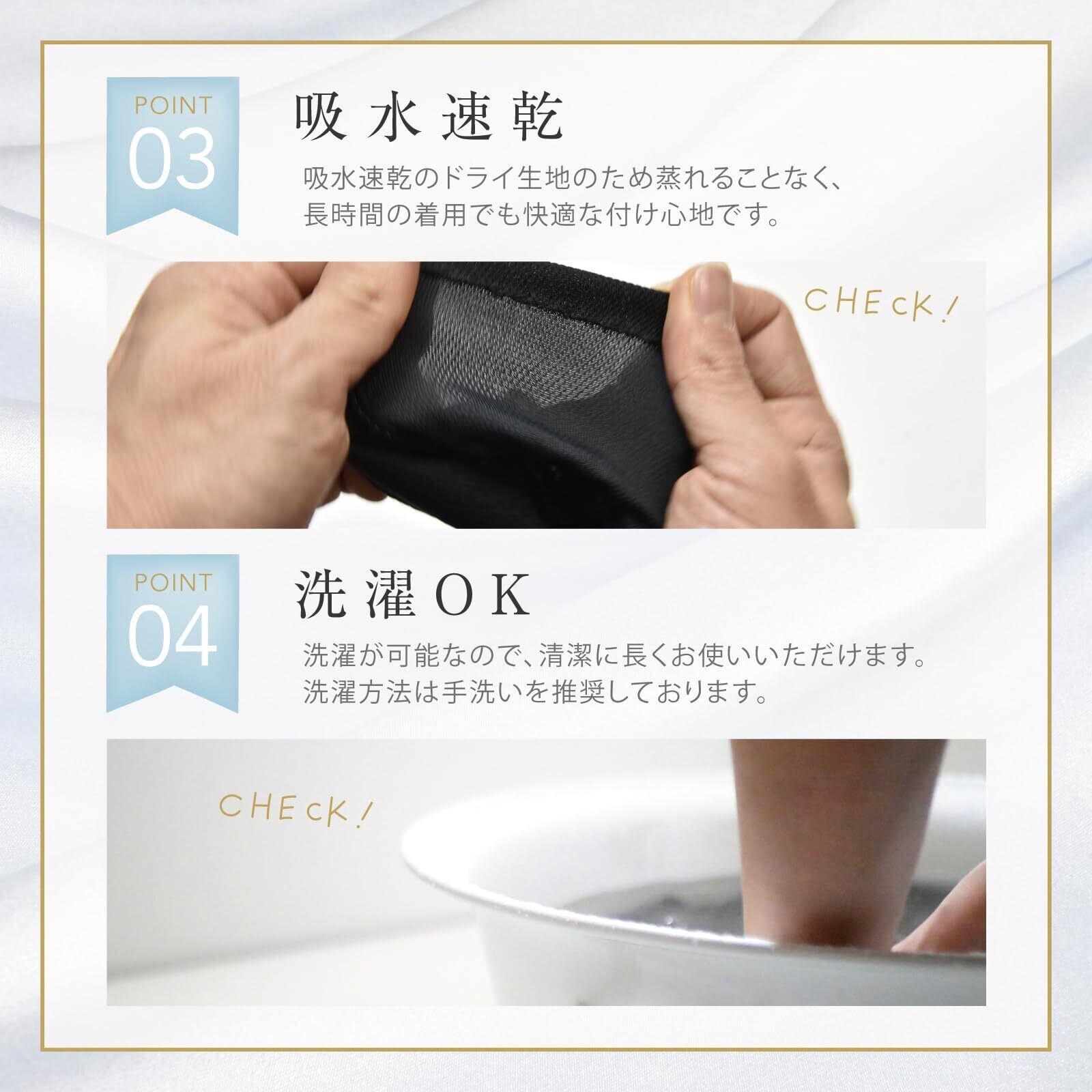 【程よい伸縮性】触ると柔らかくサラッとしており、伸縮性が程よくあるため、付け心地がとても良いです。また洗濯しても縮むことなく伸縮性もキープしたままなので、清潔に長くお使いいただけます。洗濯方法は手洗いを推奨しております。
