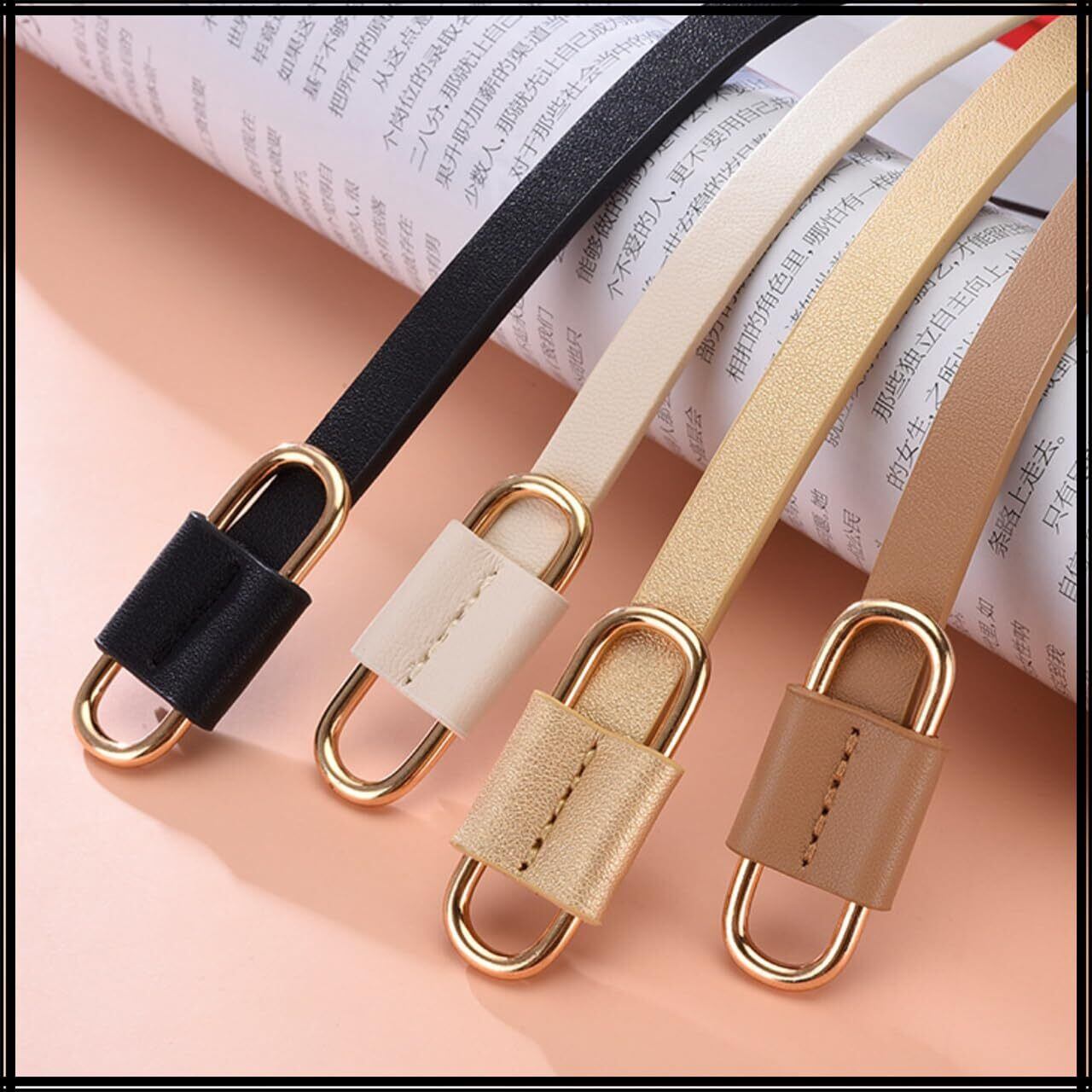 ゴールド の オーバル型 バックル にワンカラーが シンプル で スタイリッシュ な レディース レザー 細ベルト。差し込むだけで簡単、極細穴なしベルト。