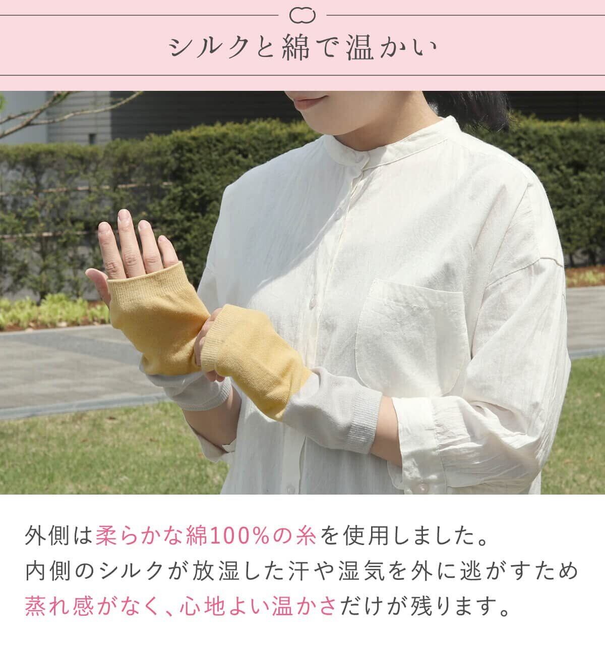 【内側シルクで、お肌に優しい】<滑らかな肌ざわり><蒸れずに快適><心地よく温める>肌に当たる面はシルク100%の糸を使用しています。なめらかな肌触りで、敏感肌の方にも安心してご使用頂けます。