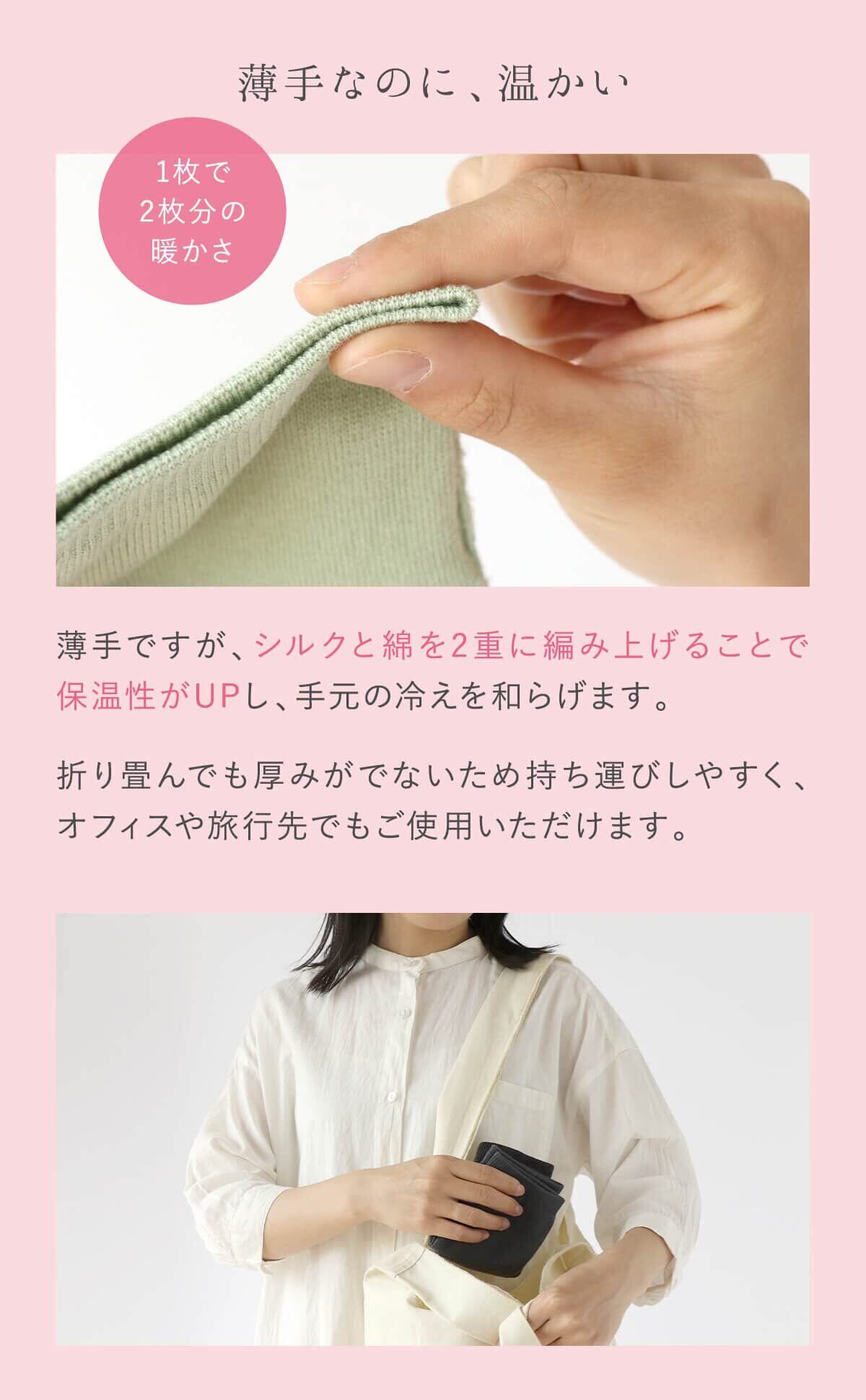 【薄手なのに、温かい】薄手ですが、シルクと綿を2重に編み上げることで、空気の層も含み保温性がUPし、手元の冷えを和らげます。折りたたんでも厚みが出ないので持ち運びしやすく、オフィスや旅行先でも手軽にご使用頂けます。