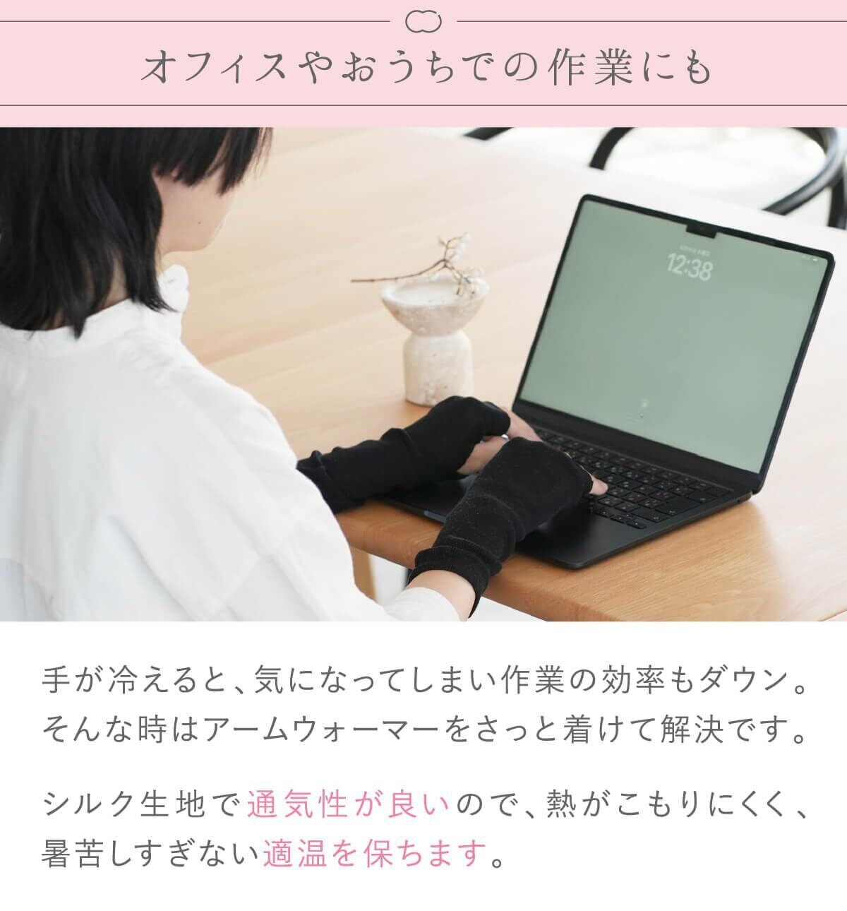 つるつると光沢のある絹紡糸(シルク)で編みたてられました。付け心地がとてもやわらかいアームウォーマーです。