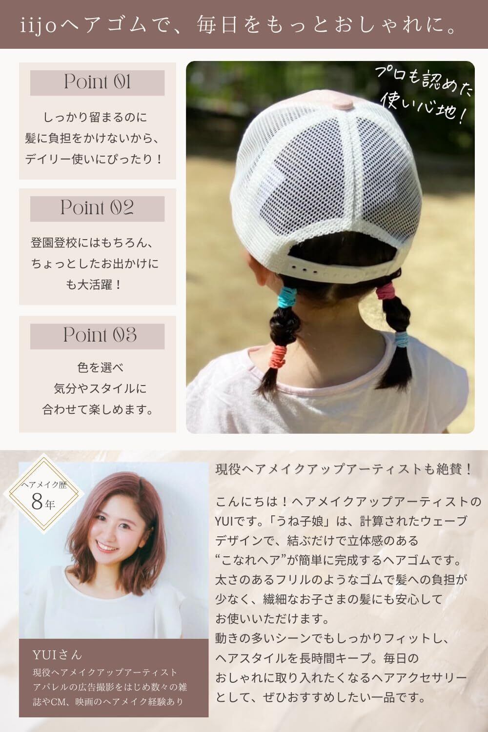 【痛くなりにくく、跡がつきにくい優しいつけ心地】 太めのうねうねゴムが髪をしっかりキャッチしながら、頭皮への負担を軽減。柔らかくフィットして痛くなりにくく、長時間つけても快適です。結び跡もつきにくく、お子様にも安心してお使いいただけます。