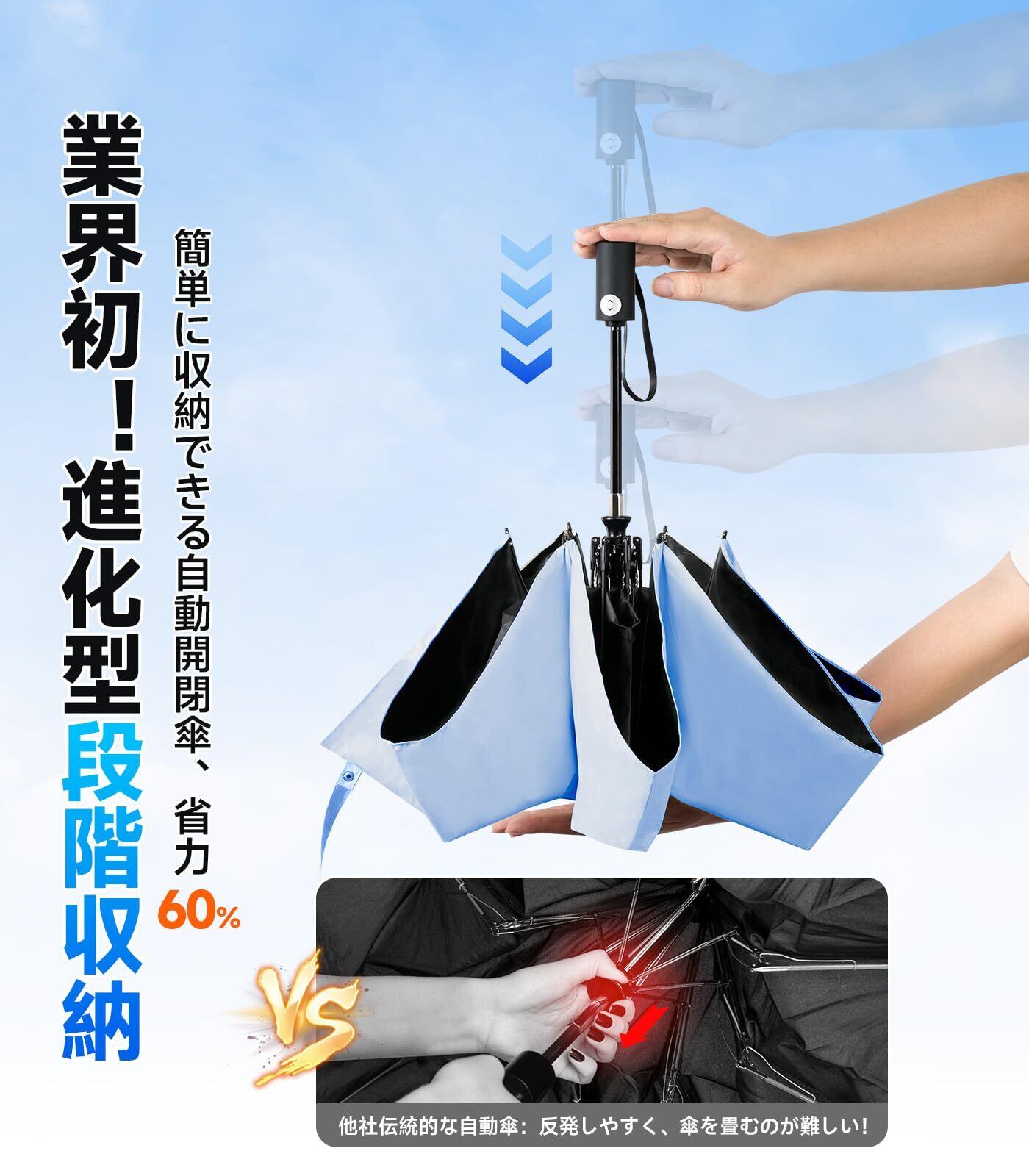 【業界初ストレスフリーな「段階収納」を新開発】 自動開閉傘にありがちな「閉じるときのバネの反発」や「力一杯押し込む手間」を解消するため、独自の段階収納システムを開発しました。一節ずつスムーズに折りたためる構造により、従来品と比較して操作力を65%も軽減。力の弱い女性やお子様、ご年配の方でも指一本でラクにしまえます。「地面に叩きつける」「お腹で押す」「ケースに無理矢理入れる」「バネが跳ね返ってケガをする」—そんなストレスから完全解放。使いやすさにこだわった設計で、口コミでも「傘をしまうのが怖くなくなった」と大好評です。