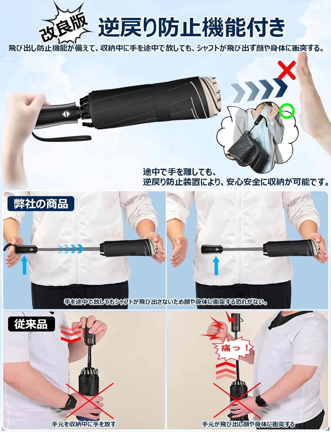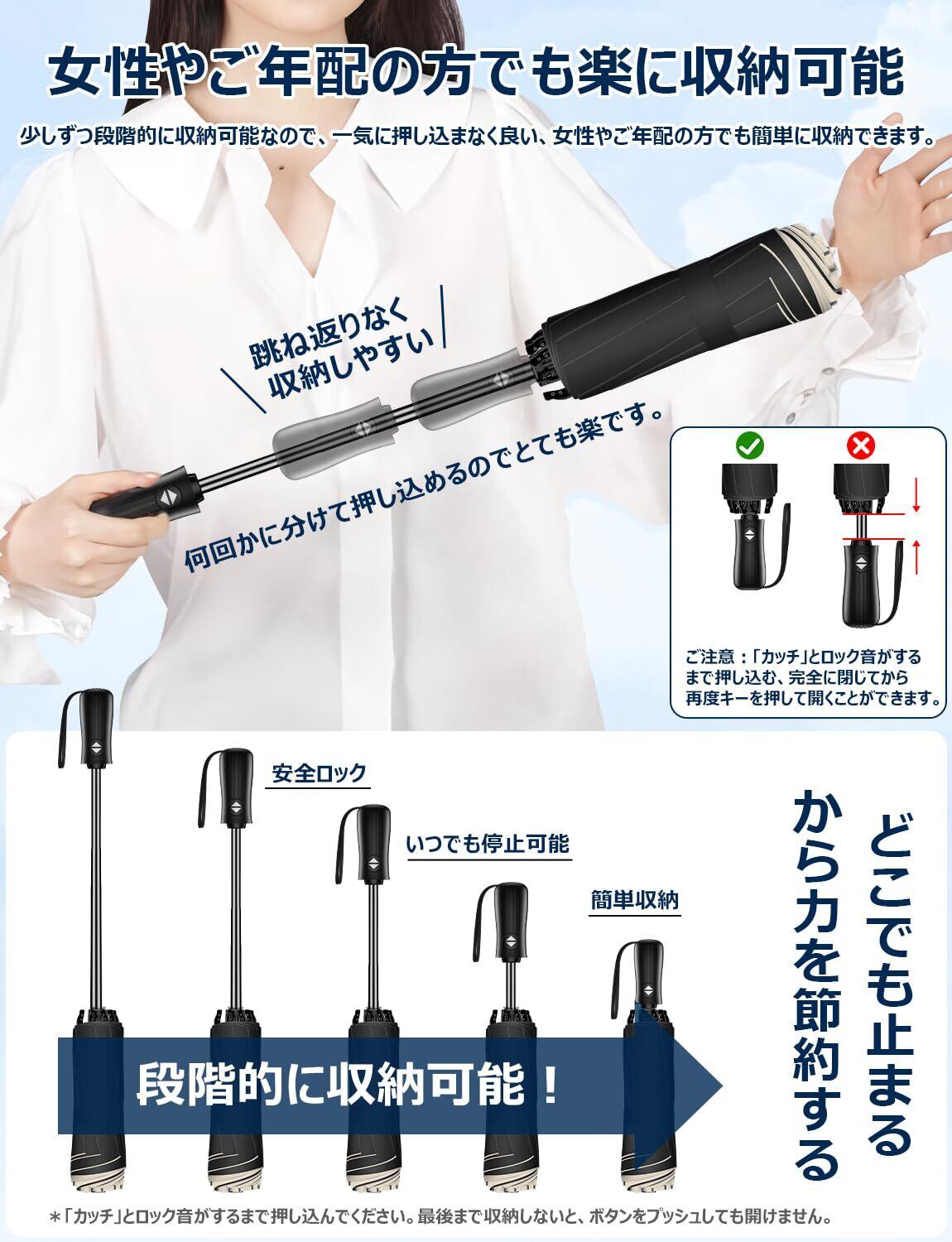 【逆戻り防止安全設計傘】✿一般的な自動開閉式折りたたみ傘はシャフトを縮める際、一気に押し込まなければバネが逆戻りして危険です。の自動開閉傘は自動開閉機能に不意な飛び出しを防ぐセーフティシャフト搭載で、一般的な自動開閉折りたたみ傘より安全に閉じられます。逆戻りしない安全式自動開閉傘は途中で手を放しても飛び出さずに、どこでも止まります!︎不意な飛び出しを防止し、段階的に収納可能なので、顔や体に衝突するおそれがなくなり、安全性が大幅に向上した折りたたみ傘です。地面や壁に当てなくても、両腕の力だけでも仕舞えるので、男性はもちろん、女性やご年配の方でも安全・簡単に操作できます。