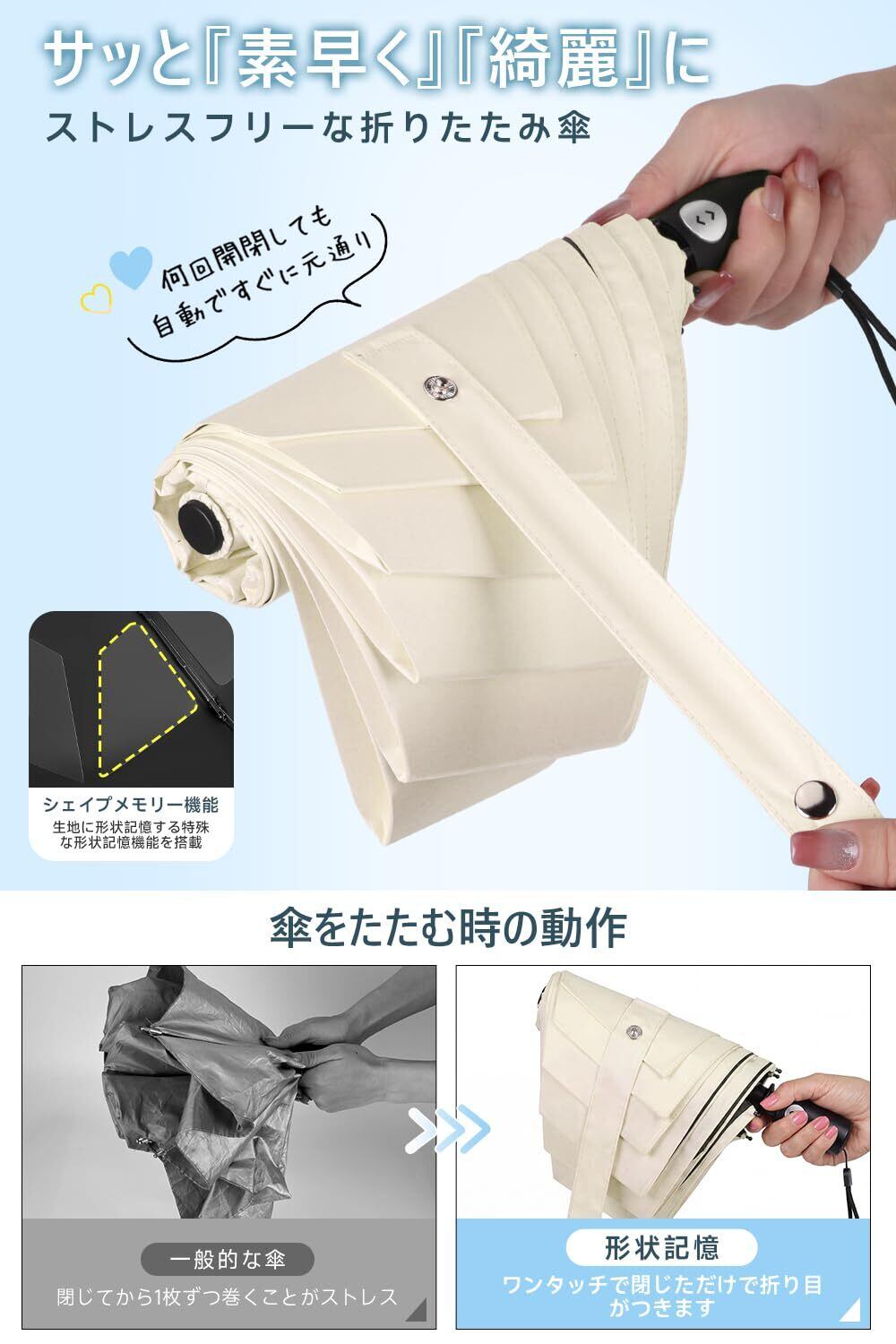 【3秒で整う形状記憶】 形状記憶設計により、たたむだけで折り目が自然に整い、わずか約3秒でスムーズに収納可能。従来のように何度も整え直す手間がなく、外出先でもサッときれいにしまえます。生地が乱れにくく、毎回気持ちよく使えるのも特長で、日常使いにも適した扱いやすい折りたたみ日傘です。